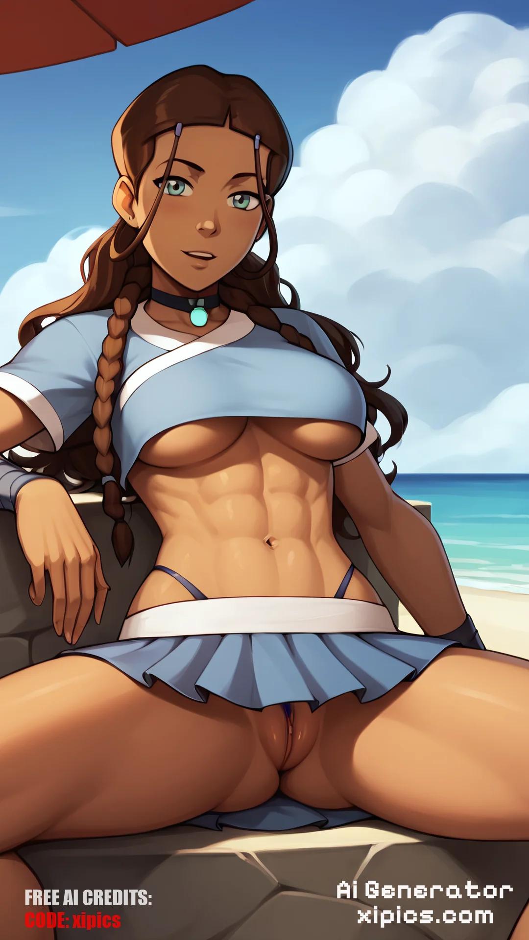 Animation score_9, score_8_up, masterpiece, best quality, 1girl, katara, toned, dark skin, brown hair, long hair, midriff, navel, crop top, underboob, short skirt, pussy behind thong, spread legs, jewelry, looking at viewer, desperate, sitting, beach background, sunshine, sky, cloud, [object Object],