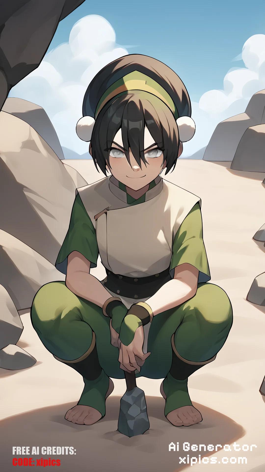score_9, score_8_up, score_7_up, score_6_up, score_5_up, score_4_up, BREAK, source_anime, 1girl, toph, bangs, black hair, blind, grey eyes, hair between eyes, hair bun, hairband, short hair, short sleeves, tunic, chinese clothes, baggy capri pants, squatting, smug, looking at viewer, outdoors, blue sky, rock, dune, sand , [object Object],