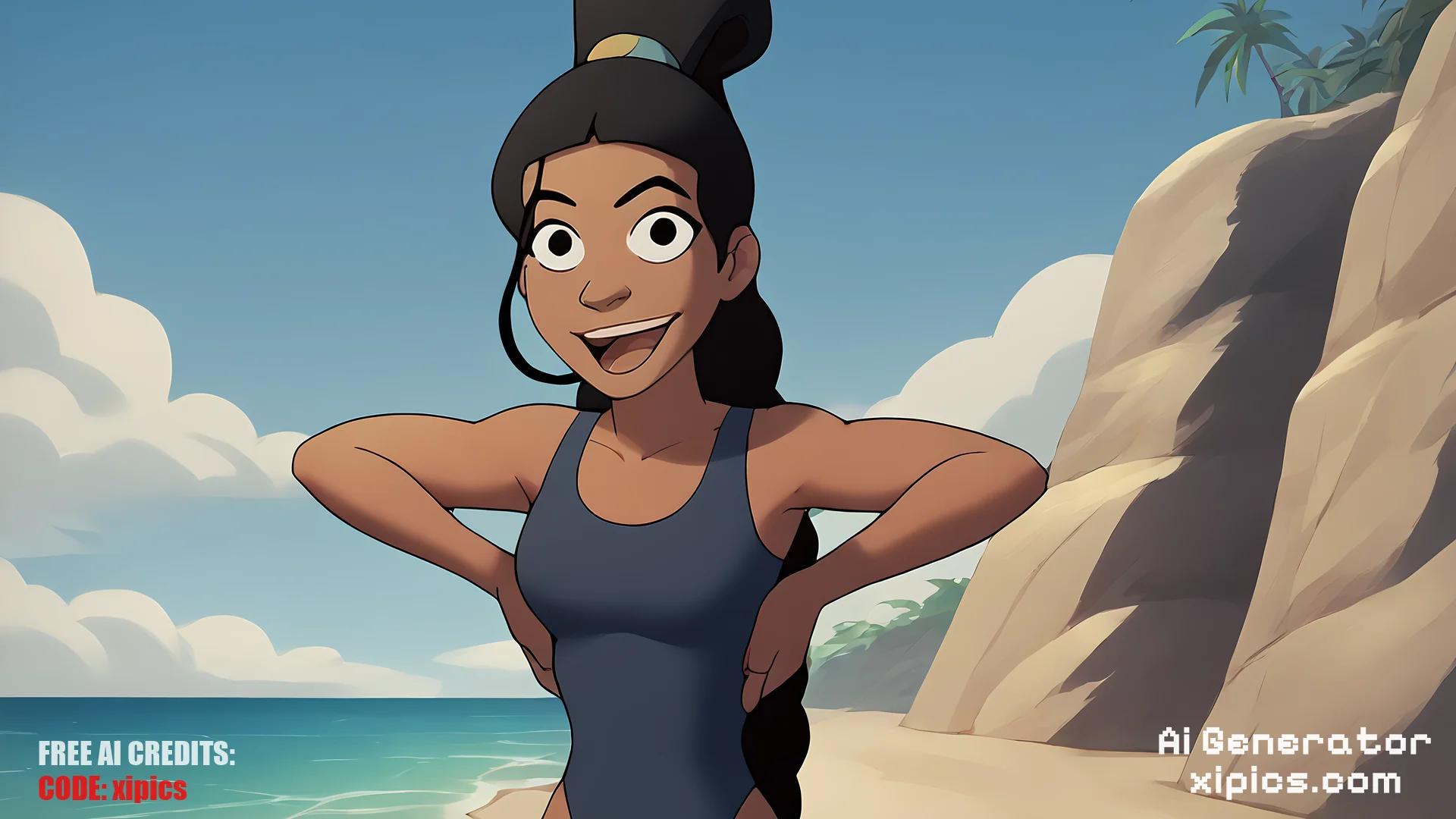 Animation score_9, score_8_up, score_7_up, score_6_up, score_5_up, score_4_up, BREAK, 1girl, pocahontas, black hair, long hair, black eyes, dark skin, G Thong, hands behind head, one-piece swimsuit, open mouth, smile, happy, solo, looking at viewer, sea, sand, blue sky, tropical island background, [object Object], [object Object], [object Object], [object Object],