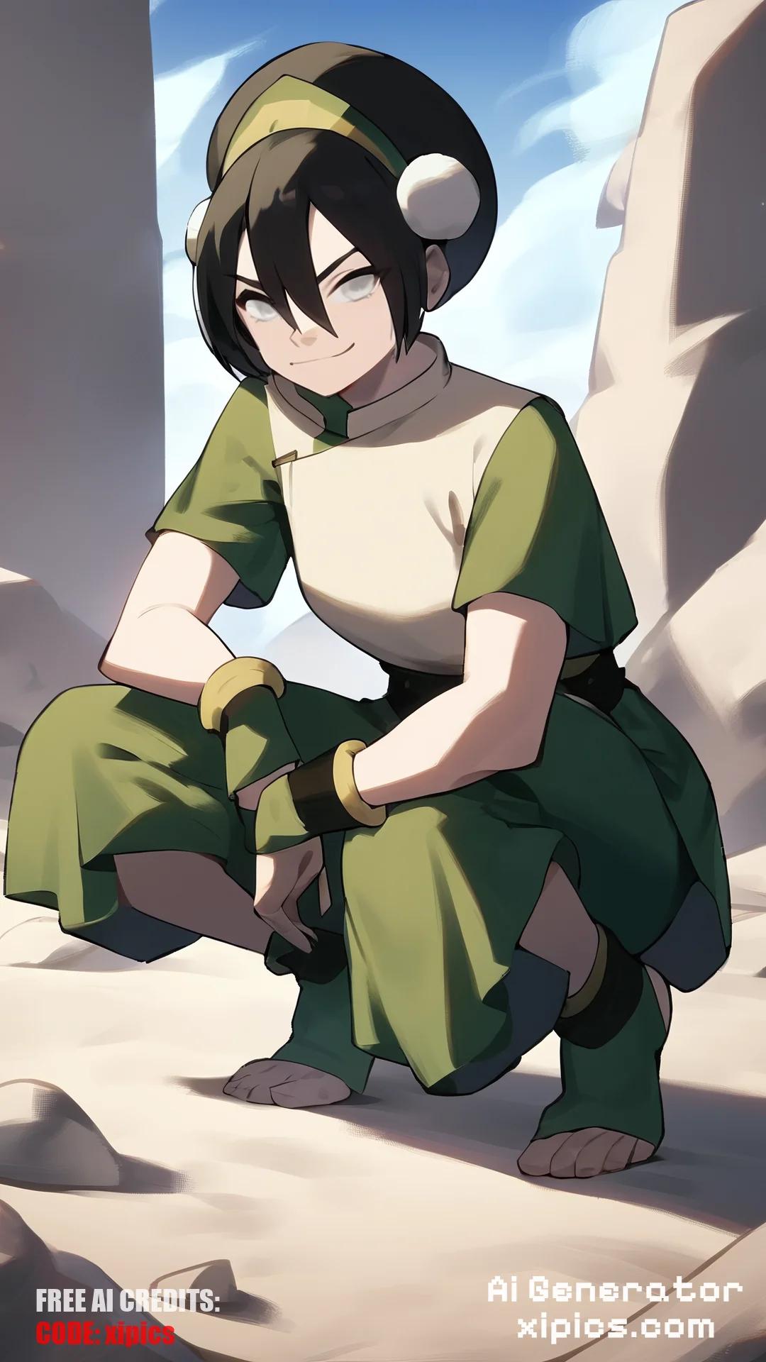 score_9, score_8_up, score_7_up, score_6_up, score_5_up, score_4_up, BREAK, source_anime, 1girl, toph, bangs, black hair, blind, grey eyes, hair between eyes, hair bun, hairband, short hair, short sleeves, tunic, chinese clothes, baggy capri pants, squatting, smug, looking at viewer, outdoors, blue sky, rock, dune, sand , 1girl, toph, bangs, black hair, blind, grey eyes, hair between eyes, hair bun, hairband, short hair,
