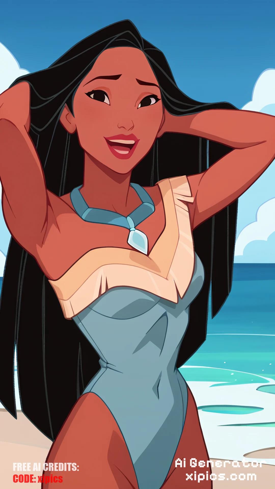 Animation score_9, score_8_up, score_7_up, score_6_up, score_5_up, score_4_up, BREAK, 1girl, pocahontas, black hair, long hair, black eyes, dark skin, G Thong, hands behind head, one-piece swimsuit, open mouth, smile, happy, solo, looking at viewer, sea, sand, blue sky, tropical island background, pocahontas, black hair, long hair, black eyes, dark skin,