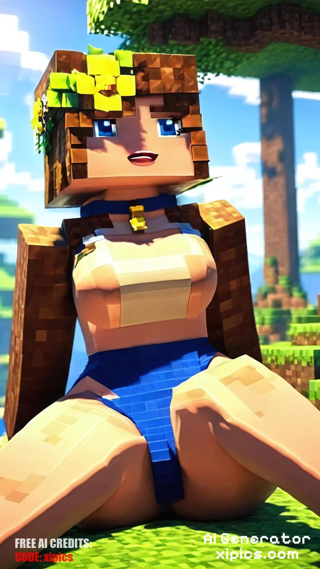 Animation score_9, score_8_up, score_7_up, score_6_up, best quality, hd, 8k masterpiece, 1girl, jenny bell, hair flower, short hair, blue eyes, brown hair, pleasured face, thick eyebrows, choker, puffy nipples, sitting, spread legs, wear bikini, looking at viewer, background Minecraft map , Minecraft trees, Minecraft, Minecraft Style,