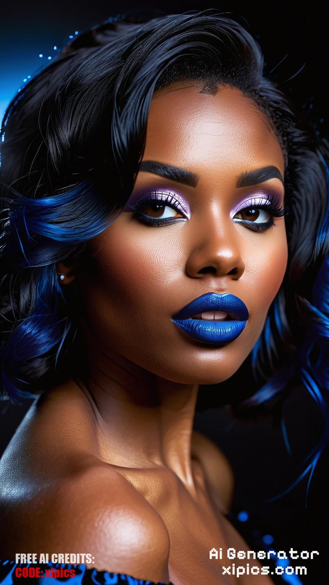 ebony woman, (to8contrast style), (Close-up portrait), open mouth, 8k RAW photo, highest quality, detailed eyes, eye reflection, winged eyeliner, (looking at the viewer:1.3), perfect eyes, best shadow, intricate details, interior, (bold hair:1.3), muted colors, high contrast style, glam shot, smoldering, (sultry:1.1), dof, bokeh, intense, languid, tempting, sensual, seductive, longing, yearning, smitten, dark photography studio, minimal lighting, deep shadows, stark contrasts, dramatic highlights, (black backdrop:1.2), dimples, fullness, plumpness, natural blue lips, bold color, alluring, captivating, striking, unforgettable, stunning, breath-taking, timeless beauty. (bare shoulders:1.2), headshot,