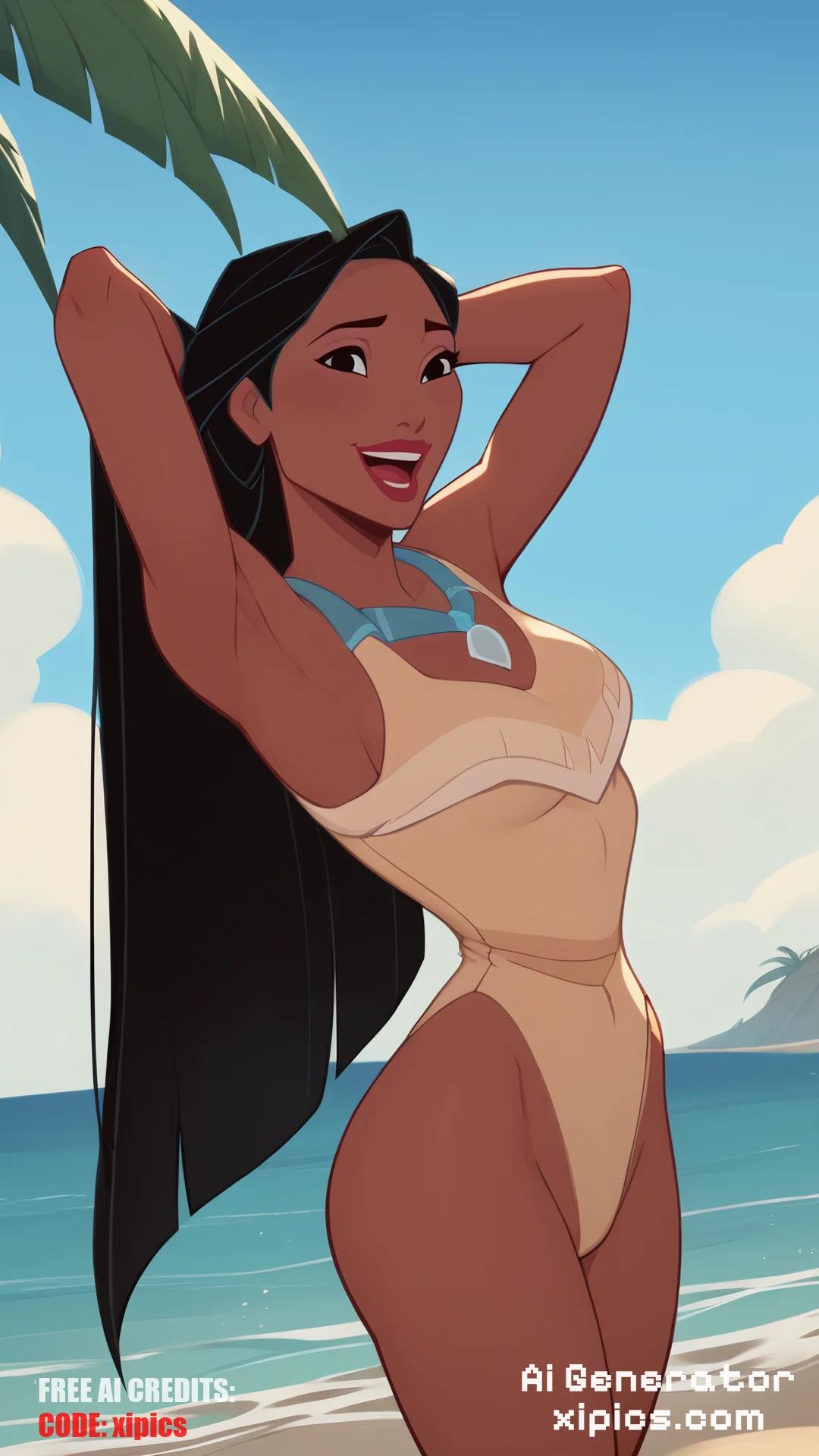 Animation score_9, score_8_up, score_7_up, score_6_up, score_5_up, score_4_up, BREAK, 1girl, pocahontas, black hair, long hair, black eyes, dark skin, G Thong, hands behind head, one-piece swimsuit, open mouth, smile, happy, solo, looking at viewer, sea, sand, blue sky, tropical island background, pocahontas, black hair, long hair, black eyes, dark skin,