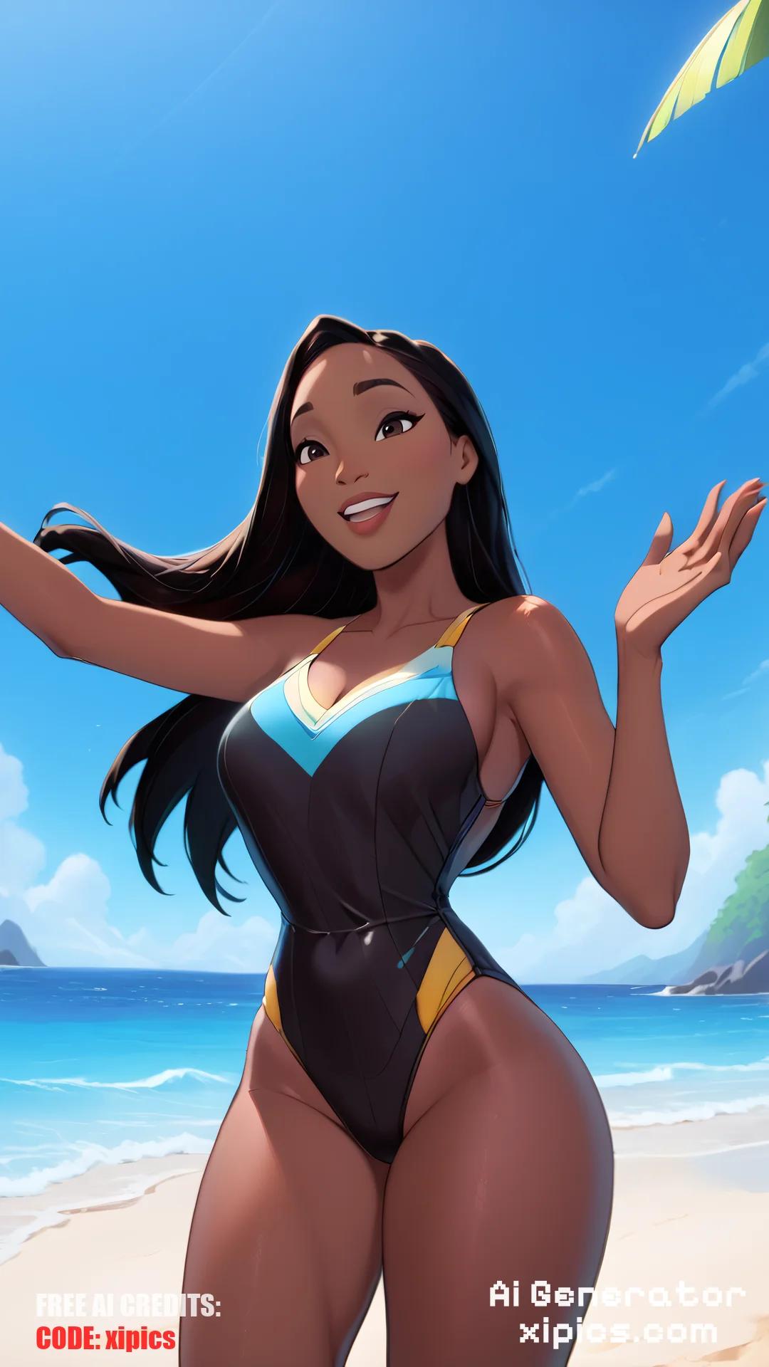 Animation score_9, score_8_up, score_7_up, score_6_up, score_5_up, score_4_up, BREAK, 1girl, pocahontas, black hair, long hair, black eyes, dark skin, G Thong, hands behind head, one-piece swimsuit, open mouth, smile, happy, solo, looking at viewer, sea, sand, blue sky, tropical island background, pocahontas, black hair, long hair, black eyes, dark skin,