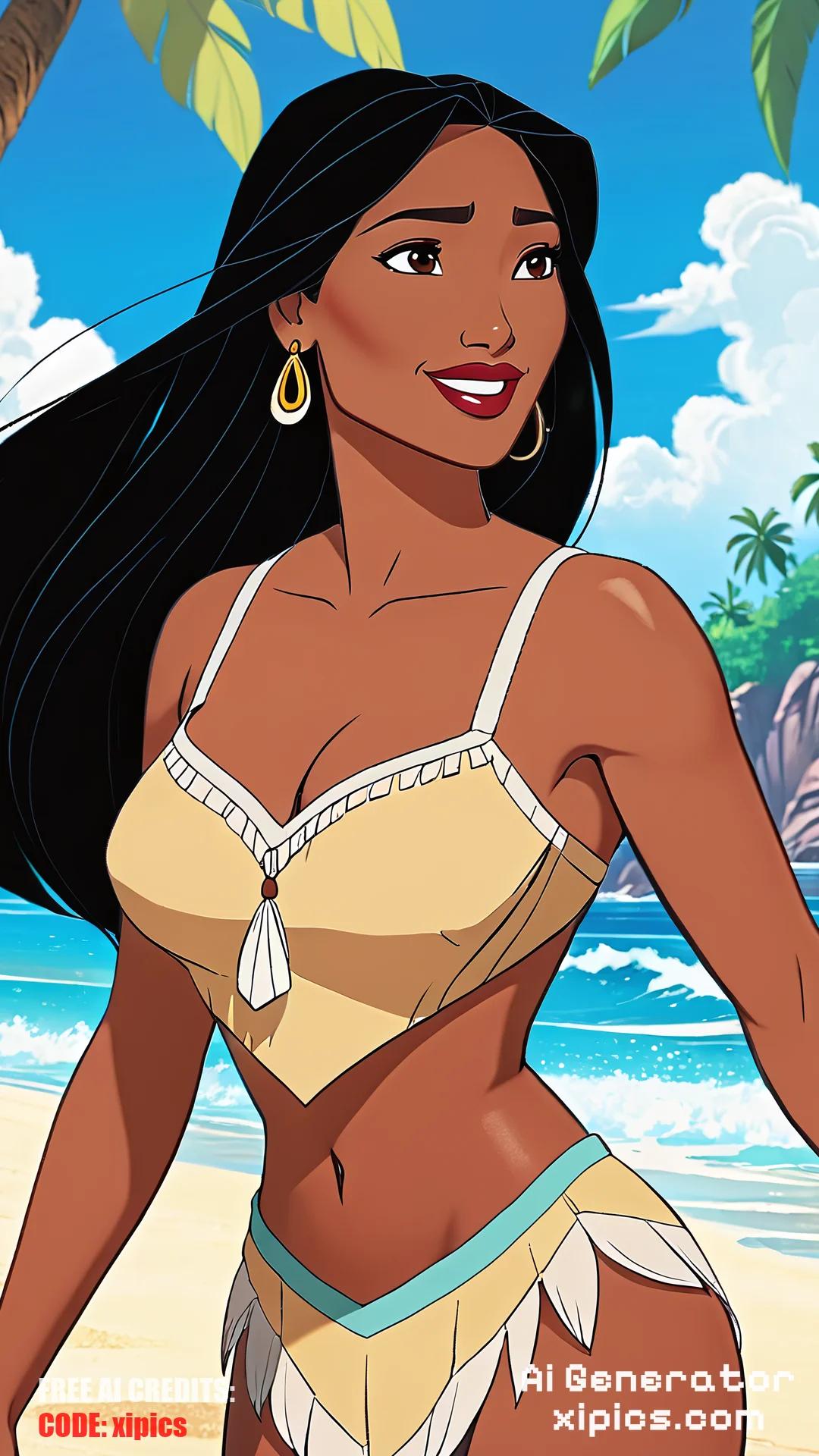 Animation score_9, score_8_up, score_7_up, score_6_up, score_5_up, score_4_up, BREAK, 1girl, pocahontas, black hair, long hair, black eyes, dark skin, G Thong, hands behind head, one-piece swimsuit, open mouth, smile, happy, solo, looking at viewer, sea, sand, blue sky, tropical island background, pocahontas, black hair, long hair, black eyes, dark skin,