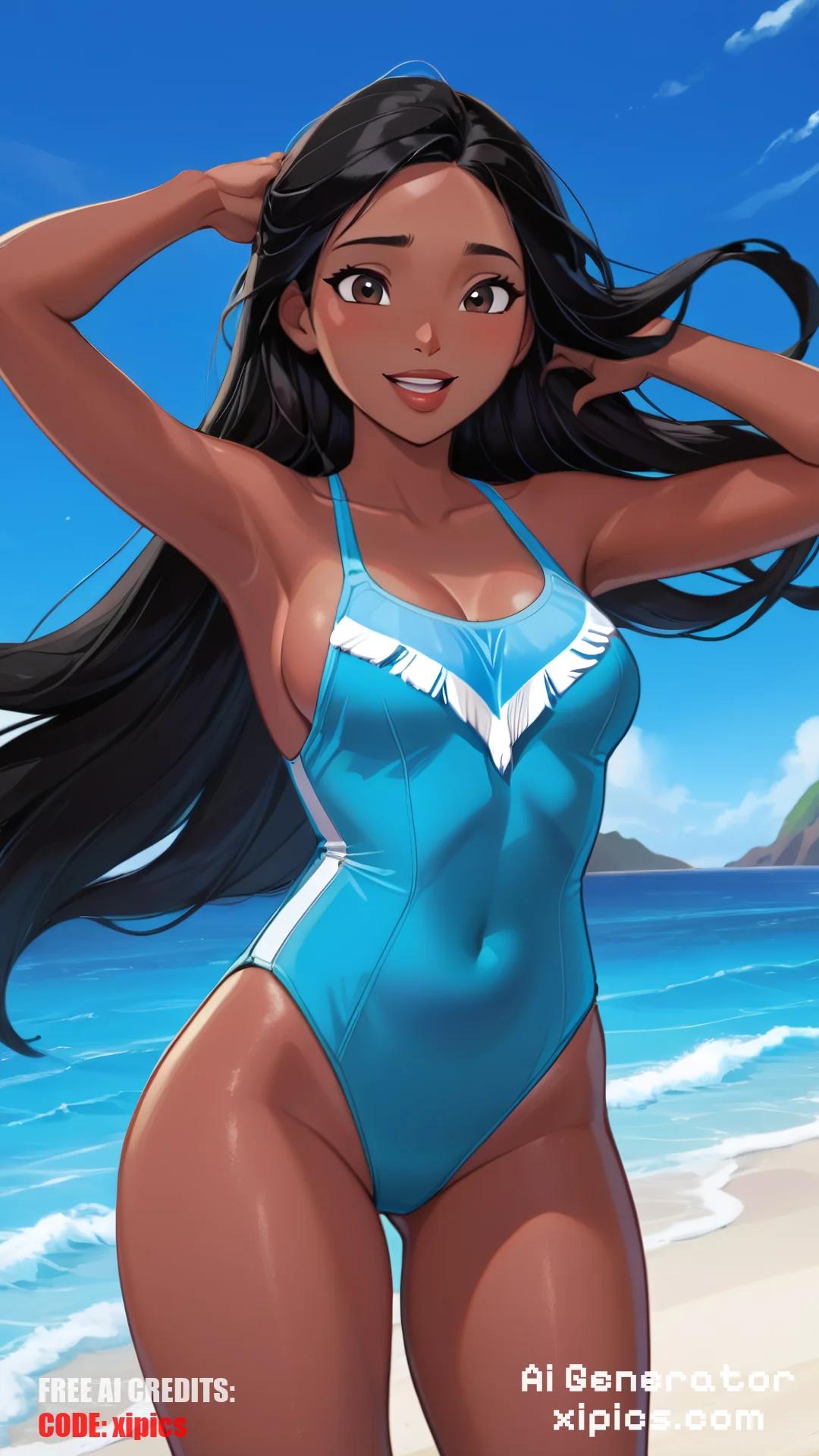 Animation score_9, score_8_up, score_7_up, score_6_up, score_5_up, score_4_up, BREAK, 1girl, pocahontas, black hair, long hair, black eyes, dark skin, G Thong, hands behind head, one-piece swimsuit, open mouth, smile, happy, solo, looking at viewer, sea, sand, blue sky, tropical island background, pocahontas, black hair, long hair, black eyes, dark skin,
