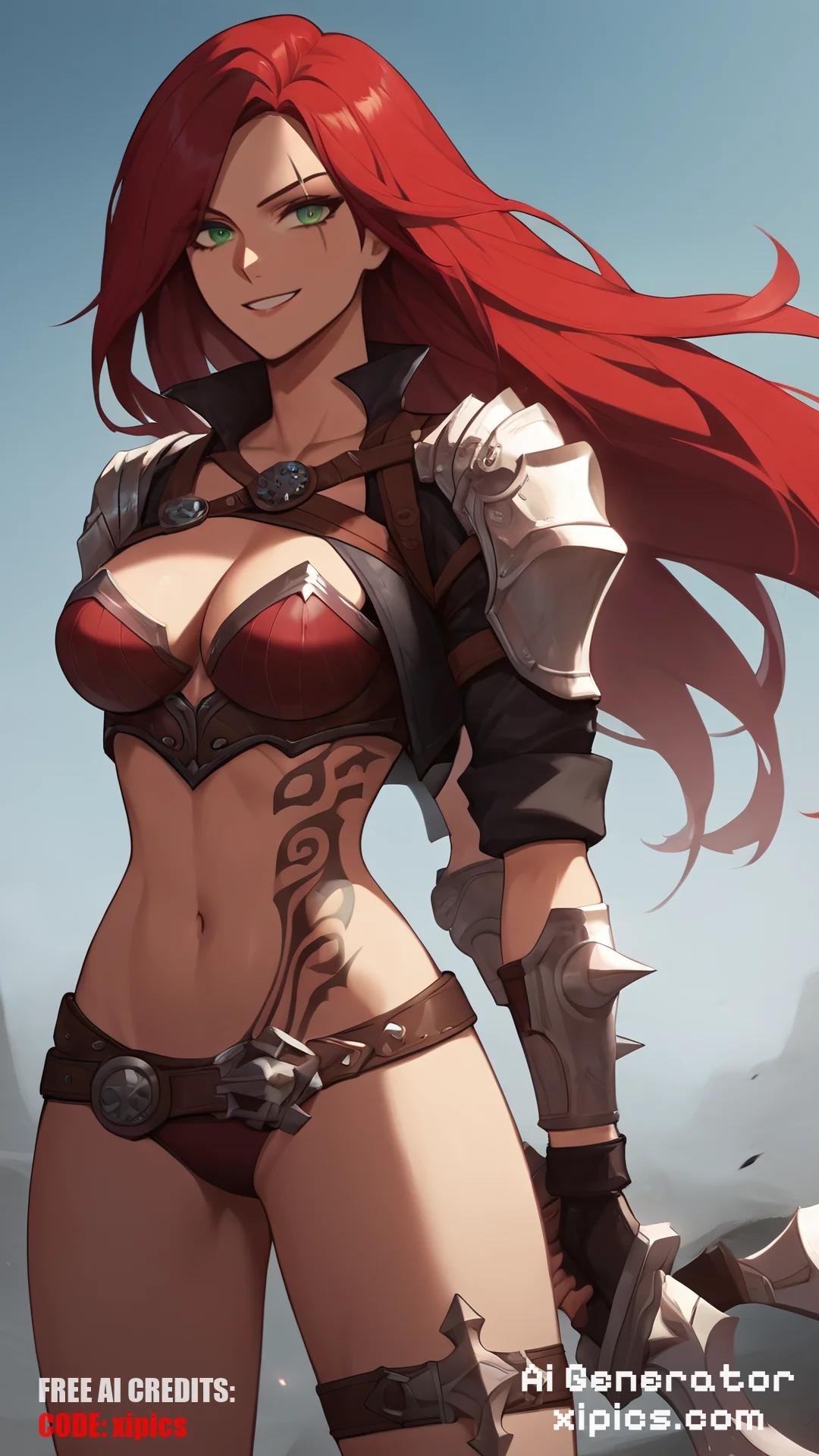 Animation score_9, score_8_up, score_7_up, score_6_up, score_5_up, score_4_up, BREAK, source_anime, 1girl, katarina, red hair, long hair, green eyes, scar across eye, nude, naked, armor, belt, in underwear, standing, spread legs, cleavage, midriff, navel, tattoo, hands behind back, smile, looking at viewer, solo, on battlefield, battlefield, katarina, red hair, long hair, green eyes, scar across eye,