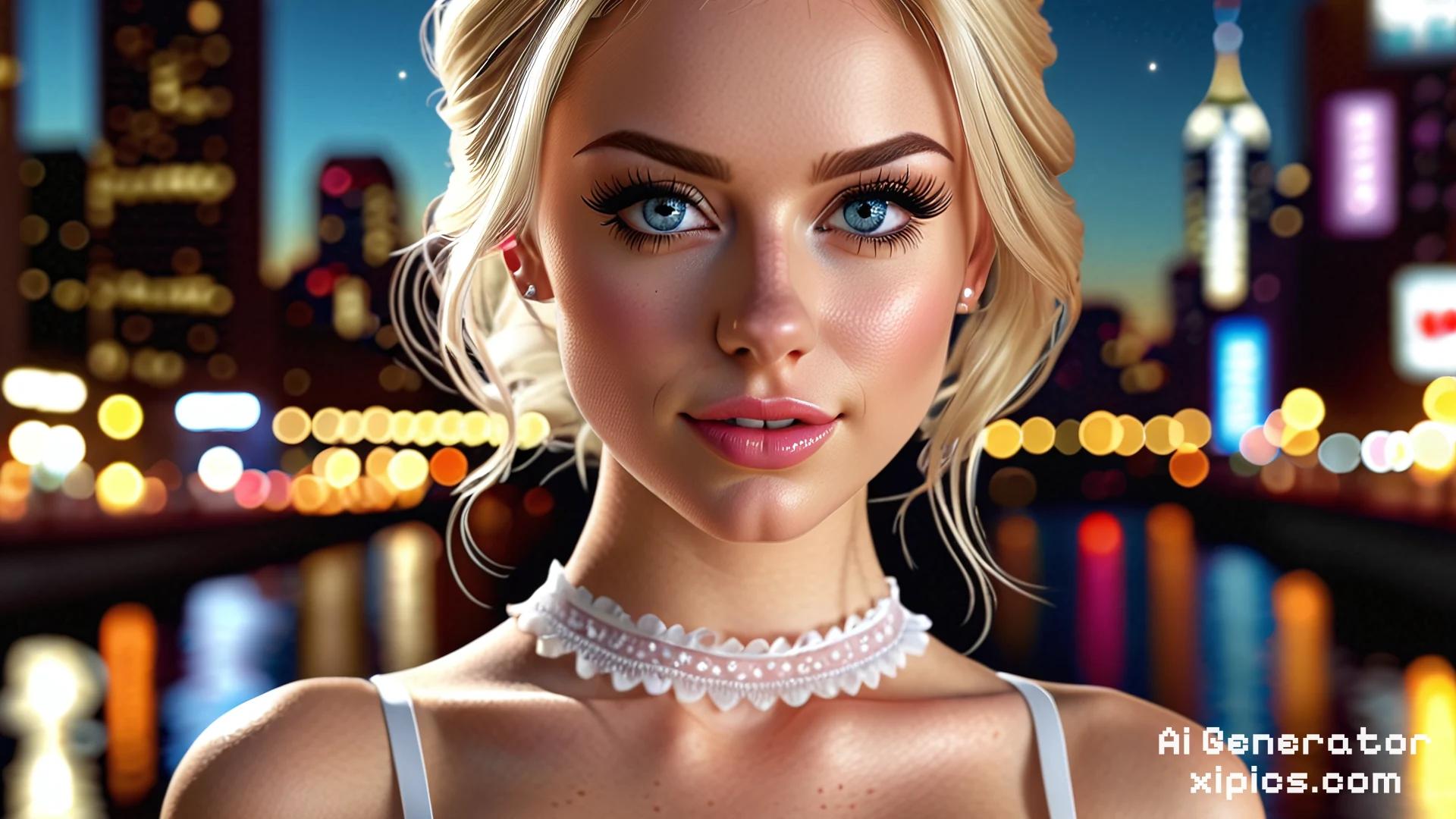 epiCRealism, realistic photo,photorealistic,full body shot, hyperrealistic,intricate details, gorgeous 18 year old blond, perfect eyes, blue eyes, ponytails, slutty, flat chest, (cleavage), fake eyelashes, black eyeliner, light makeup, (freckles:0.75), Smiling, seductive, sensual, detailed hair, (city night background, depth of field,bokeh:1.2), (skin detail, realistic dull skin noise, visible skin detail, skin fuzz, dry skin), night, pink lace choker, innocent looking, big eyes, cute face, wearing white frilly off shoulders semitransparent tank top, white lace stockings, full body view, micro skirt, tight white leggings, cameltoe,