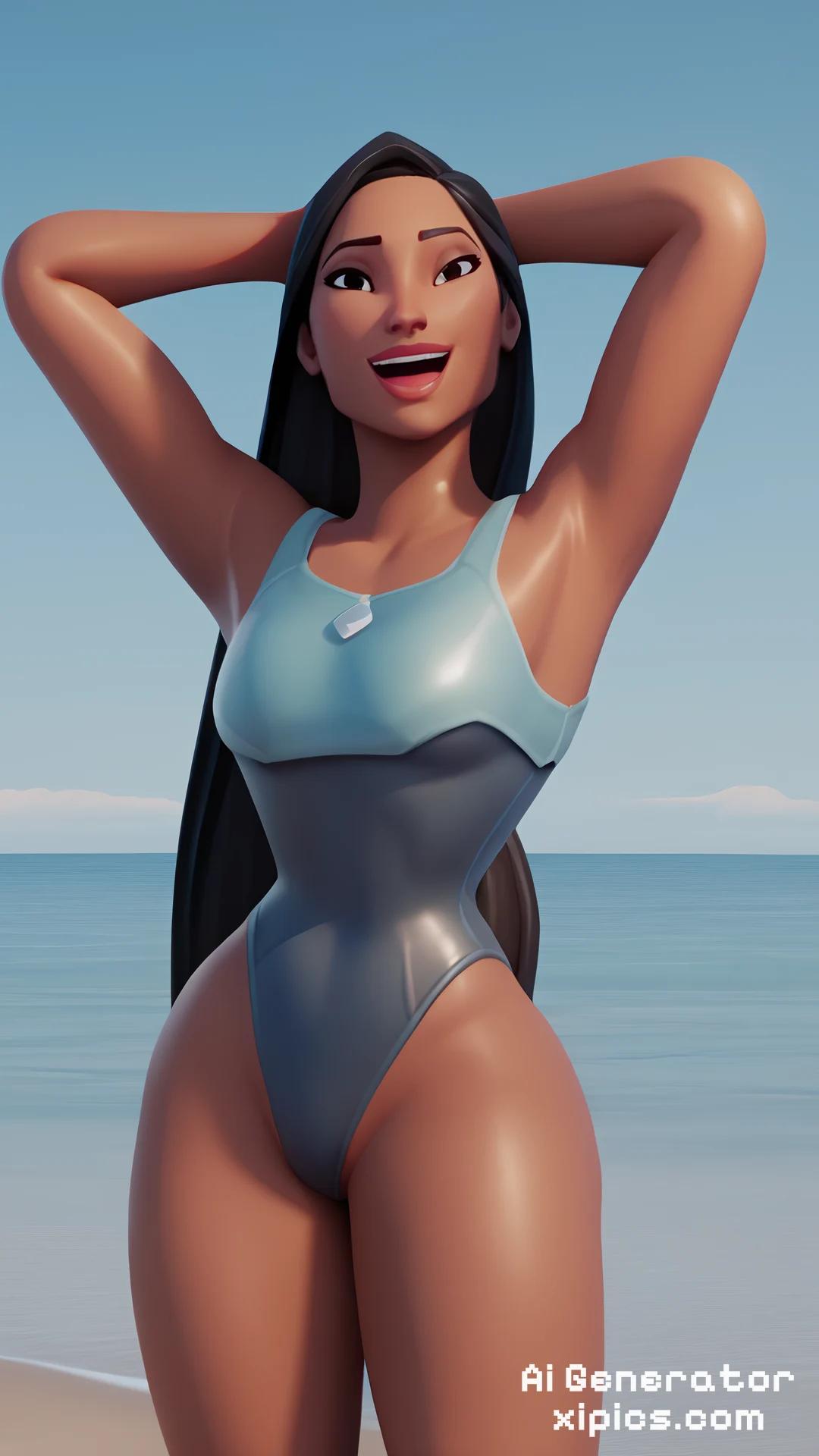 Animation score_9, score_8_up, score_7_up, score_6_up, score_5_up, score_4_up, BREAK, 1girl, pocahontas, black hair, long hair, black eyes, dark skin, G Thong, hands behind head, one-piece swimsuit, open mouth, smile, happy, solo, looking at viewer, sea, sand, blue sky, tropical island background, pocahontas, black hair, long hair, black eyes, dark skin,