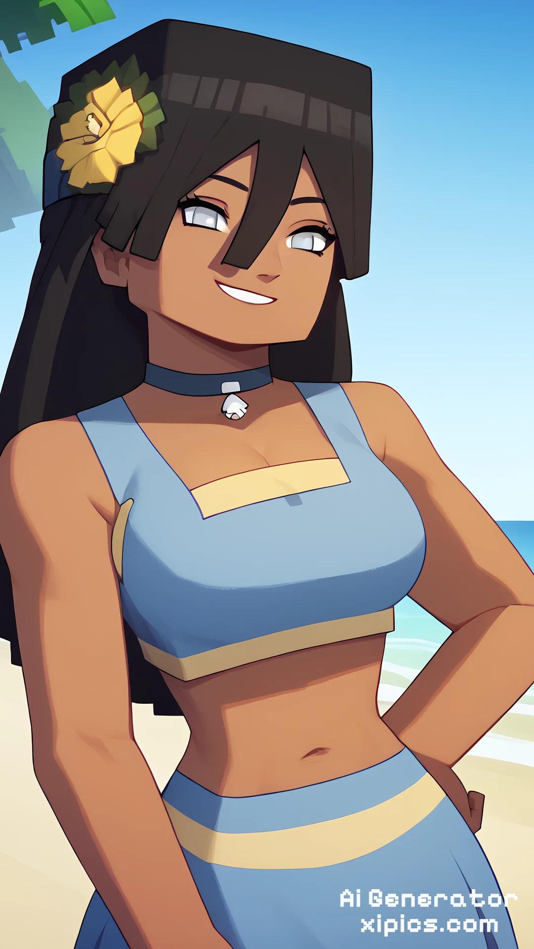 score_9, score_8_up, 1girl, margesimpson, blue hair, afro, yellow skin, bikini, smile, solo, looking at viewer, blue sky, sea, sand, tropical island background , pocahontas, black hair, long hair, black eyes, dark skin, Naruto, Hinata, Minecraft, Minecraft Style, 1girl, katara, brown hair, braid, blue dress, blue eyes, dark skin, choker, 1girl, toph, bangs, black hair, blind, grey eyes, hair between eyes, hair bun, hairband, short hair,