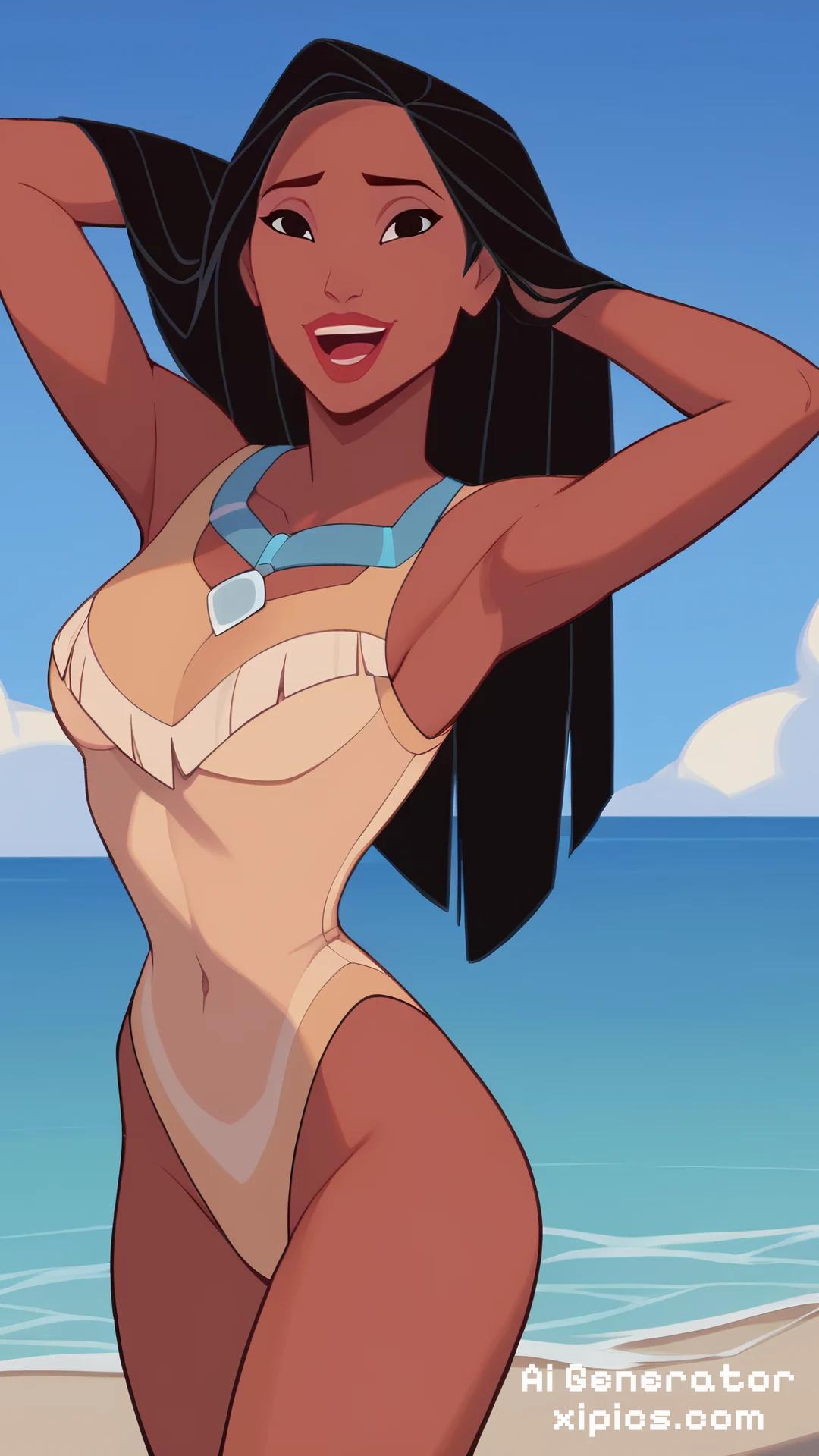 Animation score_9, score_8_up, score_7_up, score_6_up, score_5_up, score_4_up, BREAK, 1girl, pocahontas, black hair, long hair, black eyes, dark skin, G Thong, hands behind head, one-piece swimsuit, open mouth, smile, happy, solo, looking at viewer, sea, sand, blue sky, tropical island background, pocahontas, black hair, long hair, black eyes, dark skin,