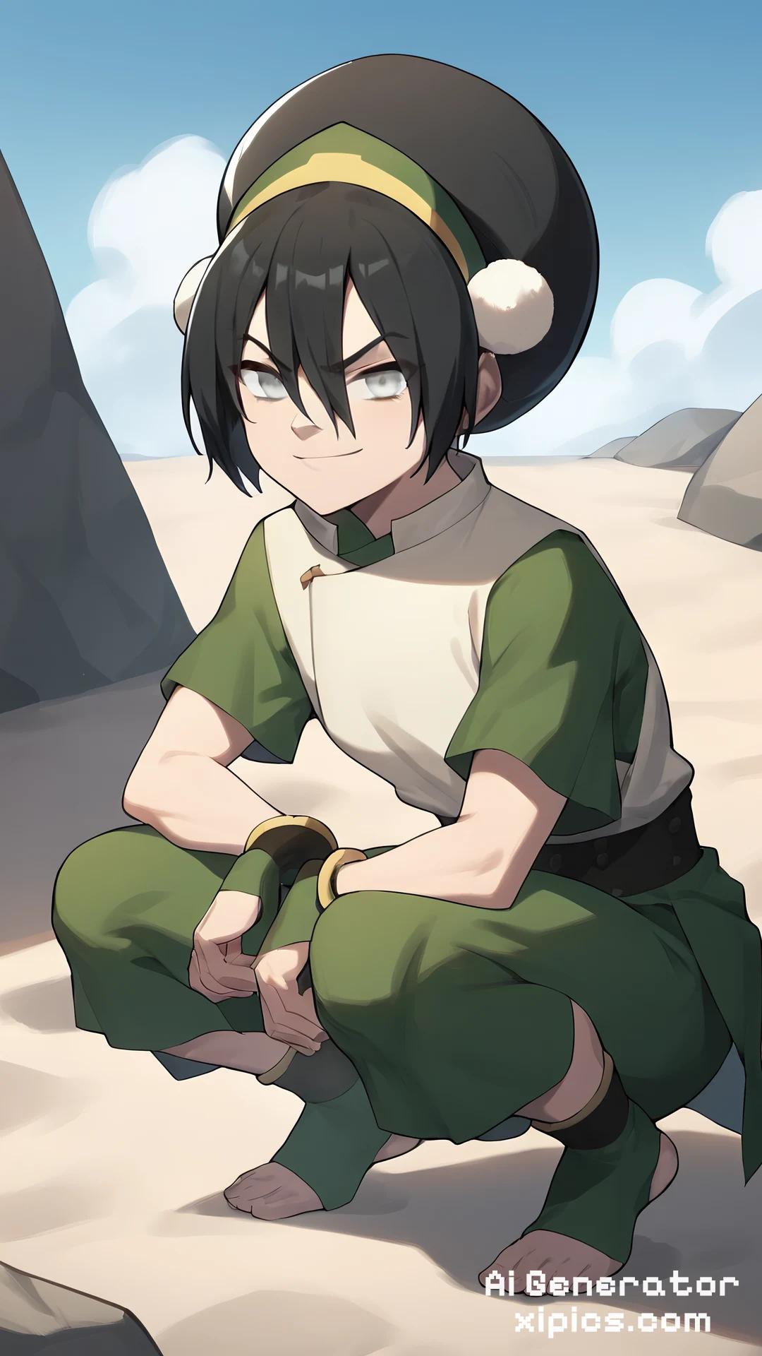 score_9, score_8_up, score_7_up, score_6_up, score_5_up, score_4_up, BREAK, source_anime, 1girl, toph, bangs, black hair, blind, grey eyes, hair between eyes, hair bun, hairband, short hair, short sleeves, tunic, chinese clothes, baggy capri pants, squatting, smug, looking at viewer, outdoors, blue sky, rock, dune, sand , 1girl, toph, bangs, black hair, blind, grey eyes, hair between eyes, hair bun, hairband, short hair,