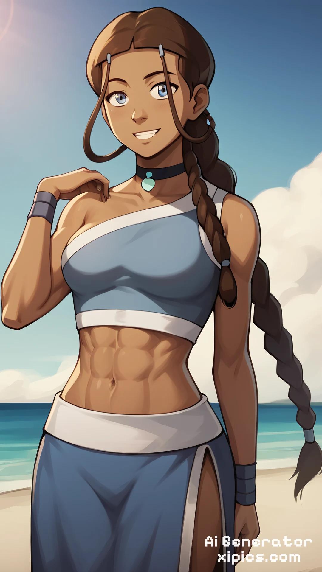 Animation score_9, score_8_up, masterpiece, best quality, 1girl, katara, toned, dark skin, brown hair, long hair, midriff, navel, crop top, jewelry, looking at viewer, smile, beach background, sunshine, sky, cloud, no clothes on, pussy, 1girl, katara, brown hair, braid, blue dress, blue eyes, dark skin, choker,