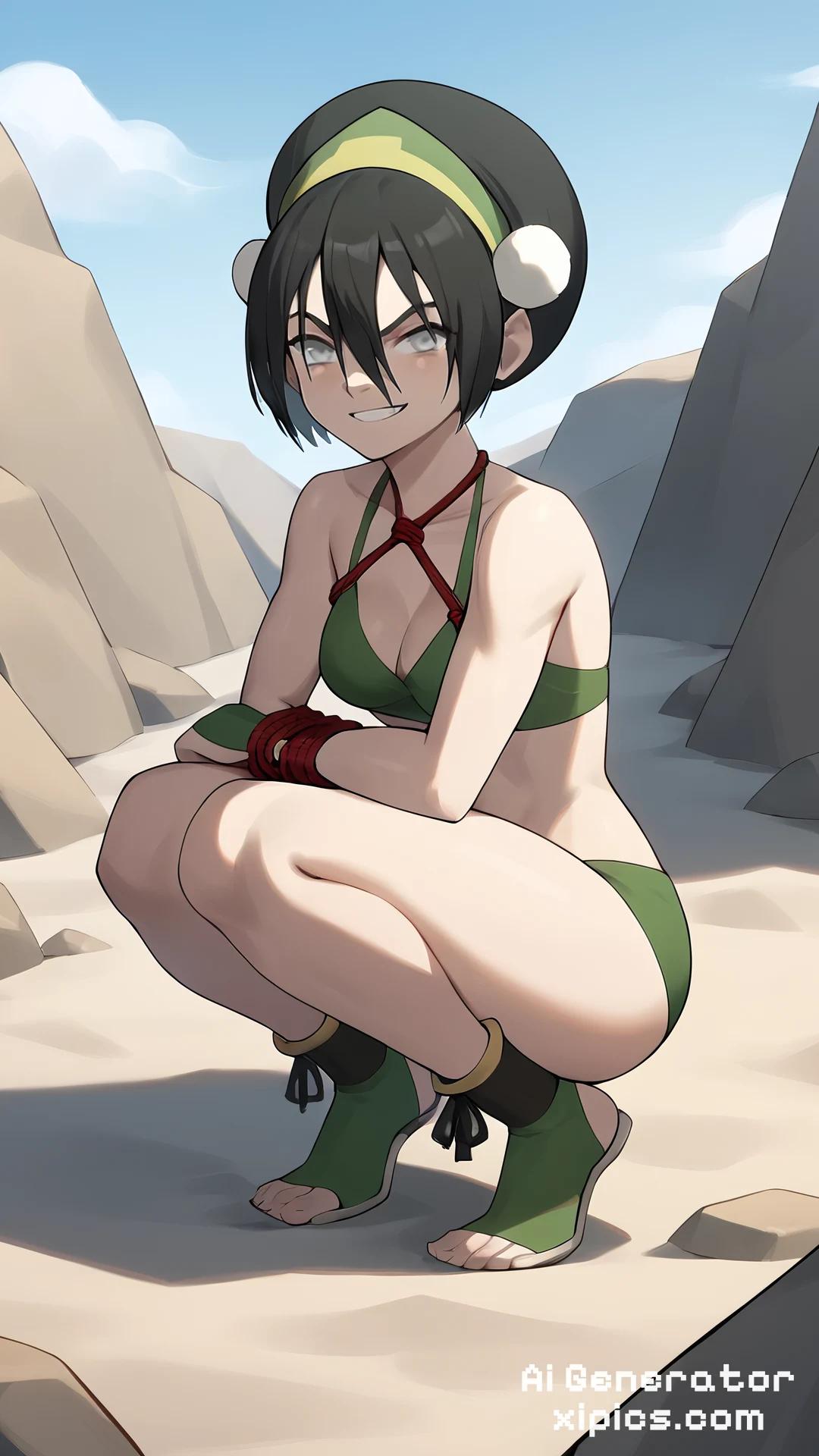 Animation score_9, score_8_up, score_7_up, score_6_up, score_5_up, score_4_up, BREAK, source_anime, 1girl, toph, bangs, black hair, blind, grey eyes, hair between eyes, hair bun, hairband, short hair, wear bikini, bdsm, bondage, rope, squatting, smug, looking at viewer, outdoors, blue sky, rock, dune, sand, Creating art with Animation, often for moving images, storytelling, or dynamic visuals, 1girl, toph, bangs, black hair, blind, grey eyes, hair between eyes, hair bun, hairband, short hair,