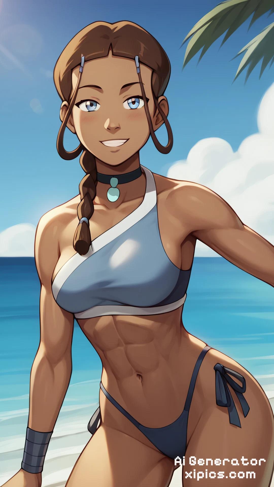 Animation score_9, score_8_up, masterpiece, best quality, 1girl, katara, toned, dark skin, brown hair, long hair, midriff, navel, bikini, thong, seductive, jewelry, looking at viewer, smile, beach background, sunshine, sky, cloud, 1girl, katara, brown hair, braid, blue dress, blue eyes, dark skin, choker,