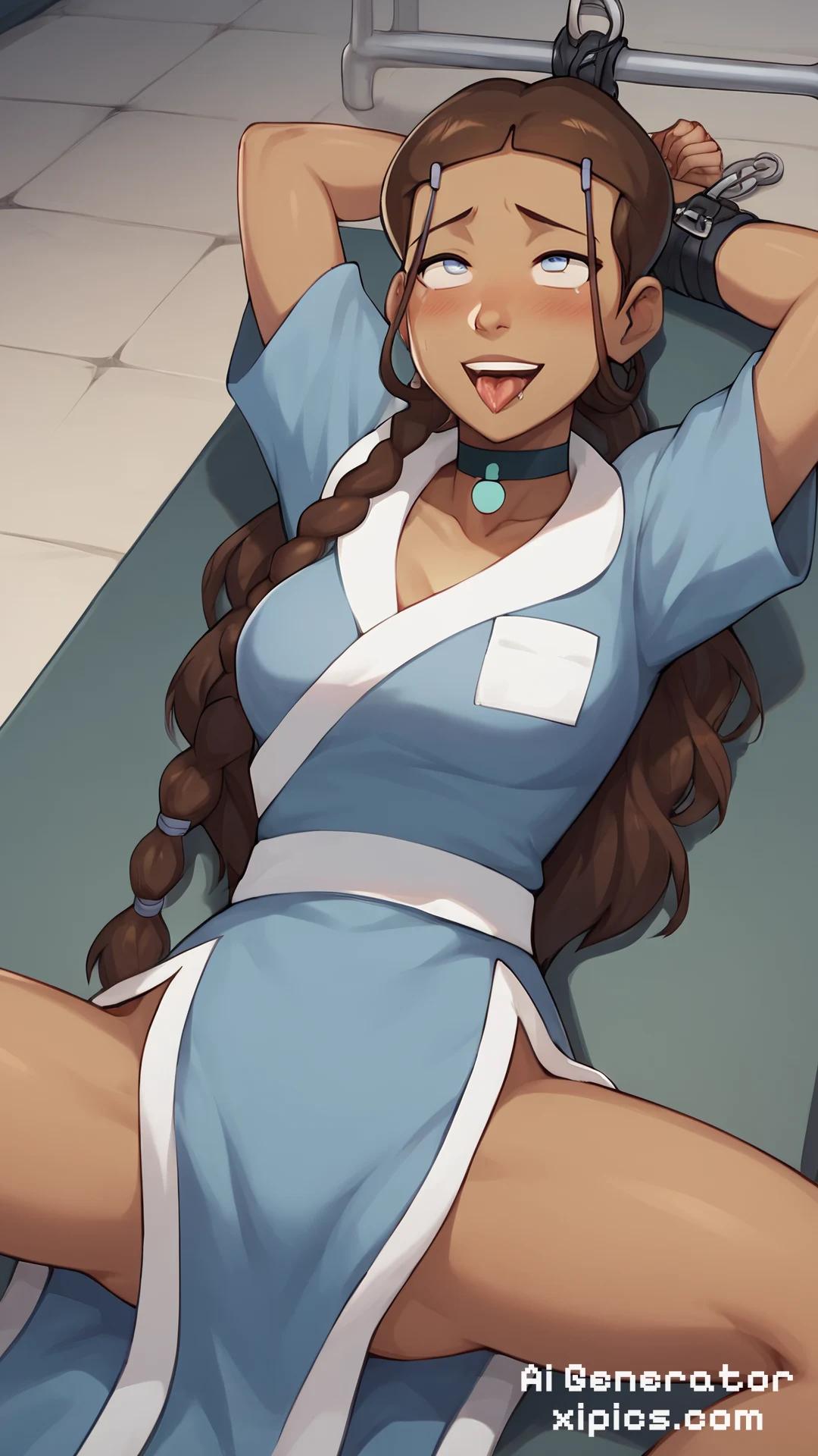 score_9, score_8_up, masterpiece, best quality, 1girl, katara, toned, dark skin, brown hair, long hair, laying ground, spread legs, cuffed, wear white lingerie, look at the viewer, horny face, she face, ahegao face, bdsm, bondage, cuffed, free use, jewelry, smile, outdoor, in hospital, Doctor table, doctor room, focused light, 1girl, katara, brown hair, braid, blue dress, blue eyes, dark skin, choker,