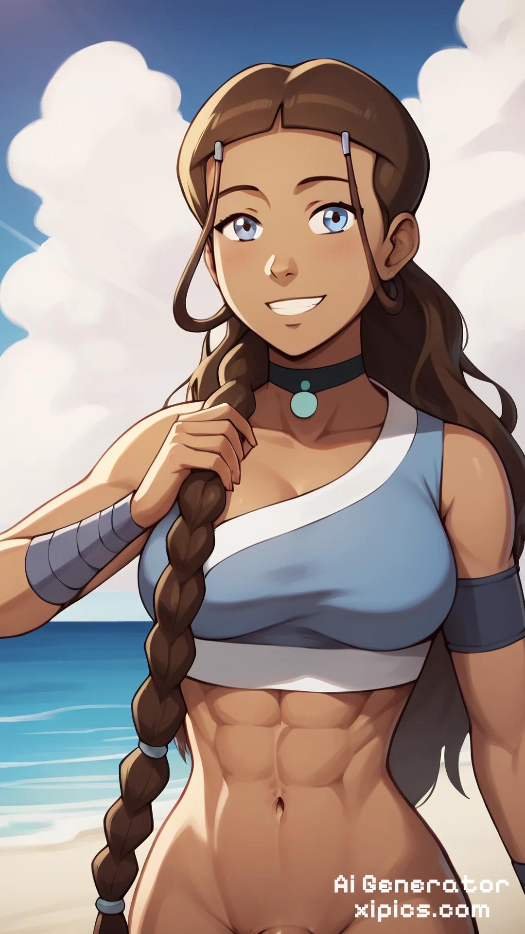 Animation score_9, score_8_up, masterpiece, best quality, 1girl, katara, toned, dark skin, brown hair, long hair, midriff, navel, crop top, jewelry, looking at viewer, completely naked, smile, beach background, sunshine, sky, cloud, futanari, large penis, 1girl, katara, brown hair, braid, blue dress, blue eyes, dark skin, choker,