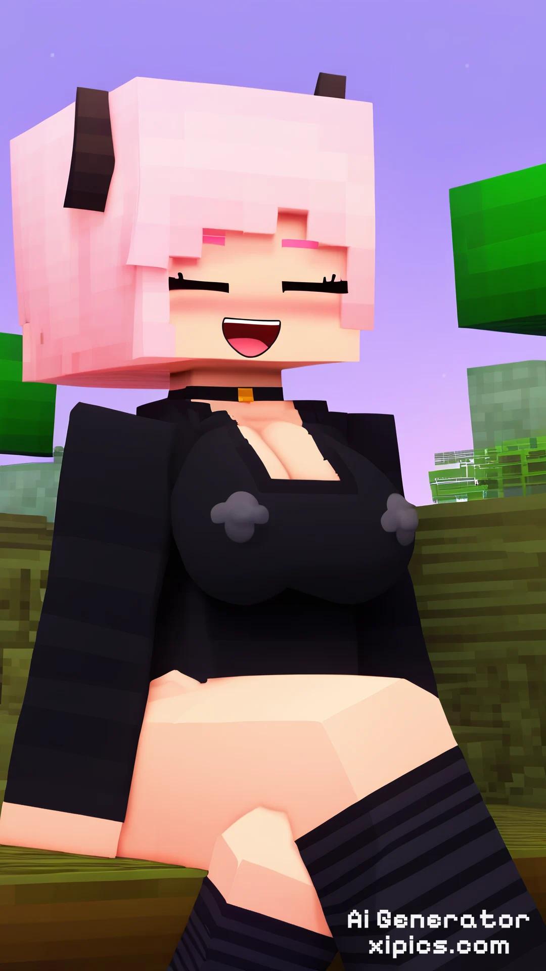 best quality, hd, 8k masterpiece, 1girl, short hair, closed eyes, pink hair, black horns, pleasured face, happy, open mouth,choker, puffy nipples, sitting, crossed legs, wear black knee socks,wear black hoodie, looking at viewer, background Minecraft map , Minecraft trees, Minecraft, Minecraft Style,