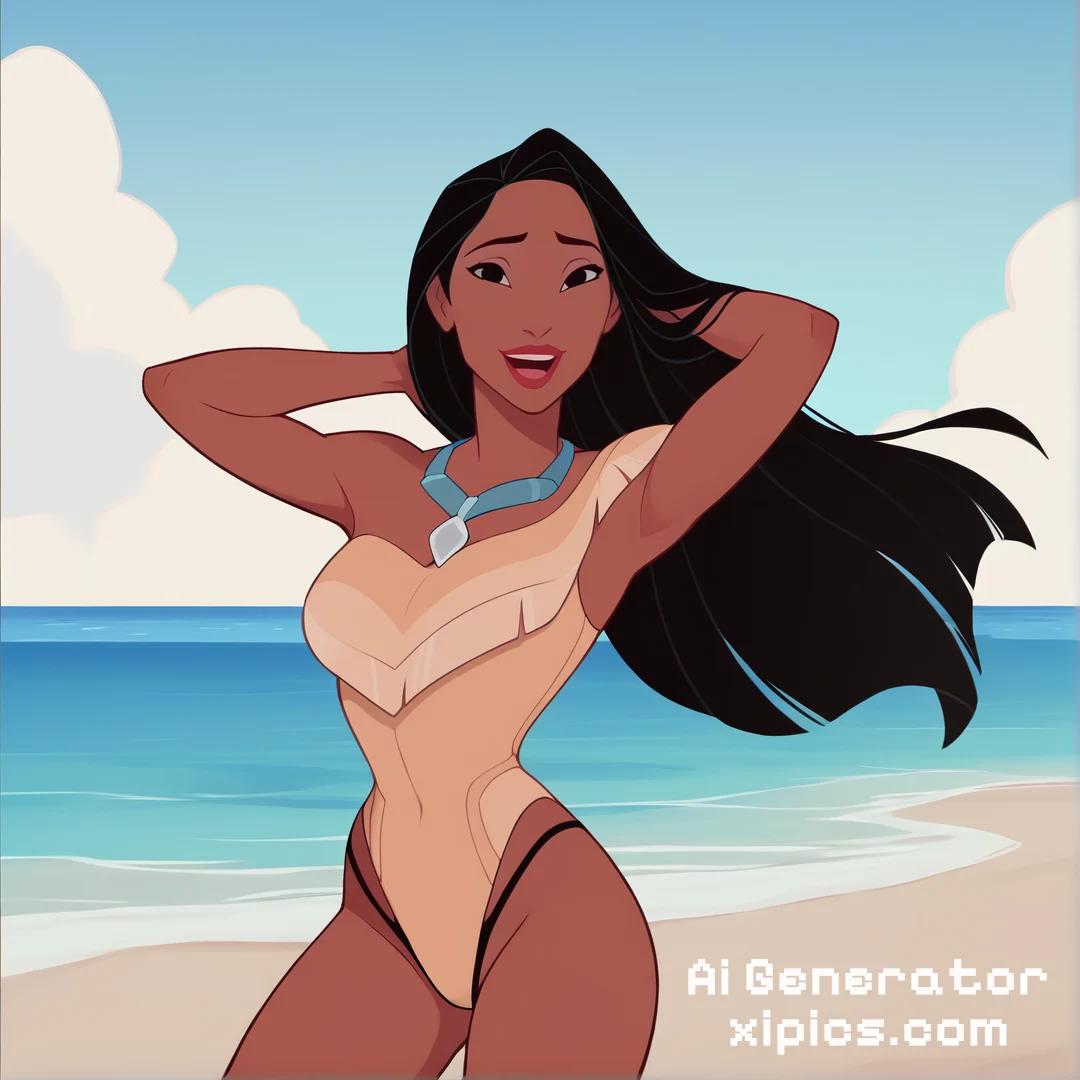 Animation score_9, score_8_up, score_7_up, score_6_up, score_5_up, score_4_up, BREAK, 1girl, pocahontas, black hair, long hair, black eyes, dark skin, G Thong, hands behind head, one-piece swimsuit, open mouth, smile, happy, solo, looking at viewer, sea, sand, blue sky, tropical island background, pocahontas, black hair, long hair, black eyes, dark skin,