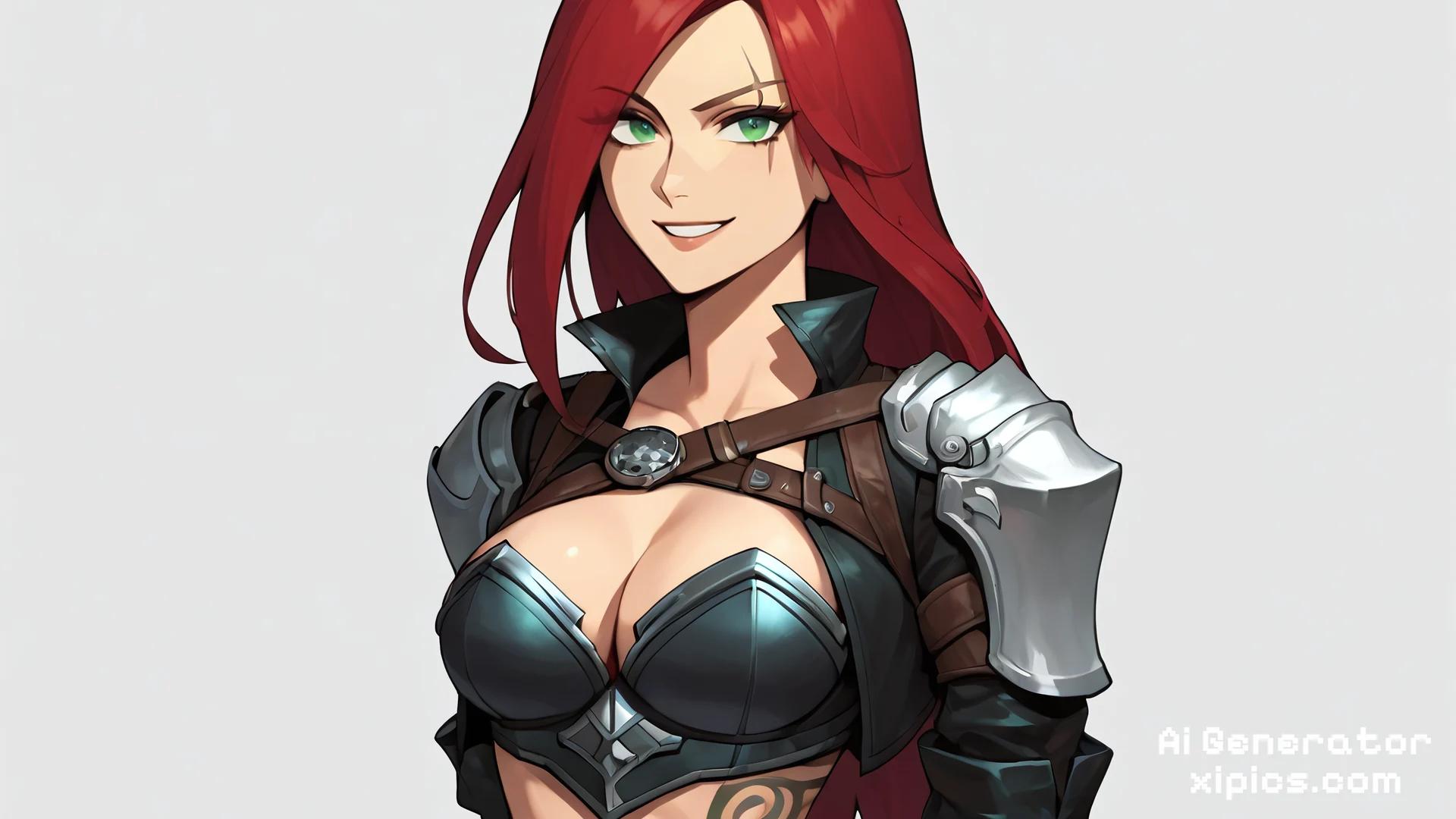 Animation score_9, score_8_up, score_7_up, score_6_up, score_5_up, score_4_up, BREAK, source_anime, 1girl, katarina, red hair, long hair, green eyes, scar across eye, cropped jacket, armor, belt, black pants, cleavage, midriff, navel, tattoo, hands behind back, smile, upper body, looking at viewer, solo, simple background, white background, creampei, dripping, katarina, red hair, long hair, green eyes, scar across eye,