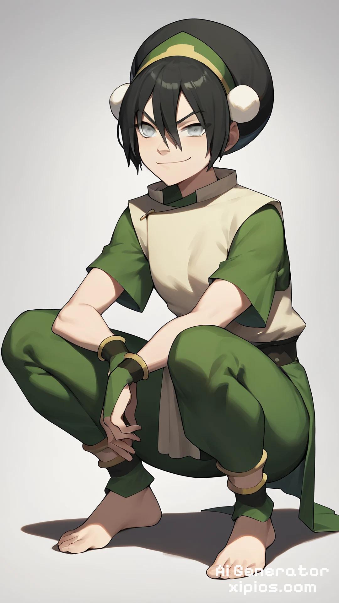 score_9, score_8_up, score_7_up, score_6_up, score_5_up, score_4_up, BREAK, source_anime, 1girl, toph, bangs, black hair, blind, grey eyes, hair between eyes, hair bun, hairband, short hair, short sleeves, tunic, chinese clothes, baggy capri pants, squatting, smug, looking at viewer, feet, barefoot, soles, 1girl, toph, bangs, black hair, blind, grey eyes, hair between eyes, hair bun, hairband, short hair,