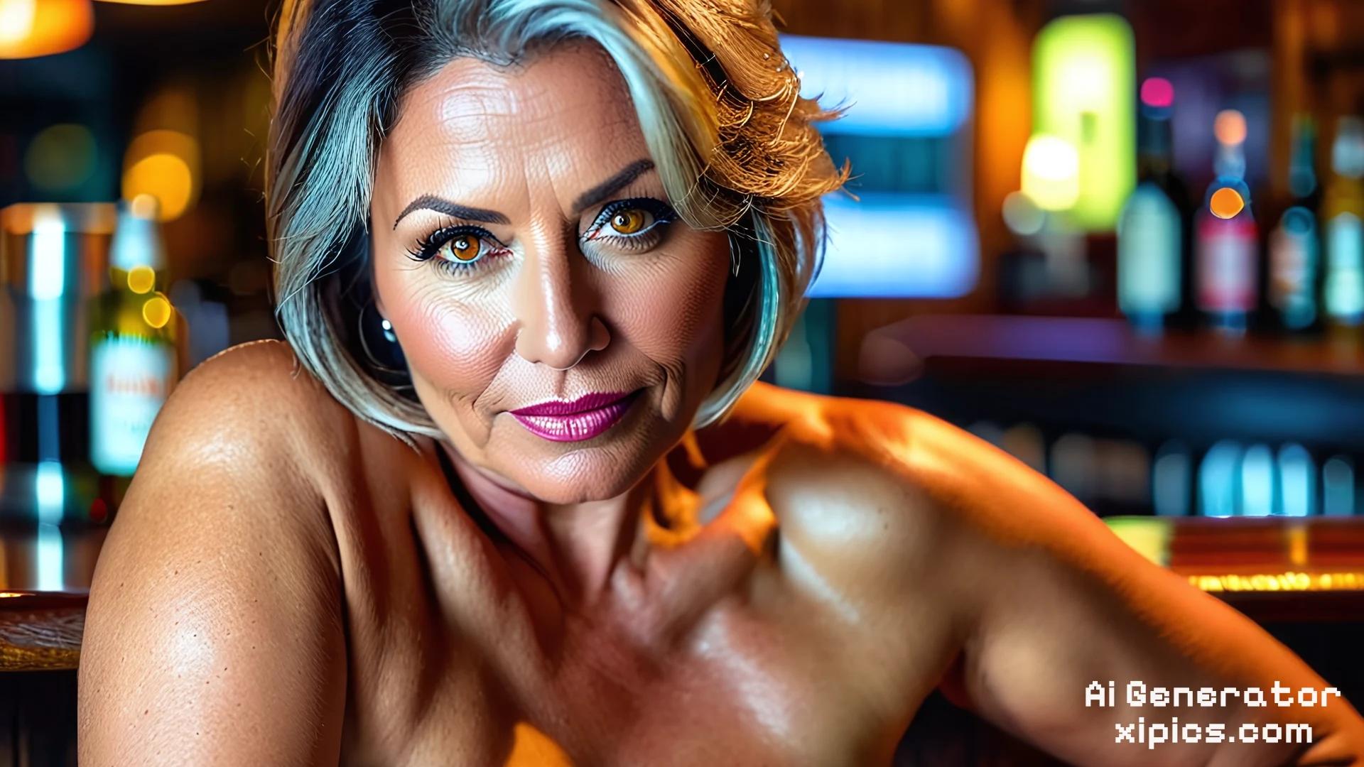 (masterpiece, best quality, high resolution:1.2), (seductive pose:1.2), casual photography, shot on Fujifilm X-T4, 56mm, f/1.2, hard shadows, RAW photo, bokeh, photon mapping, ray tracing, desaturated, soft lighting, sharp focus on subject, detailed face, detailed eyes, detailed skin, yom_fmruth, solo, looking at viewer, chubby, realistic, brown eyes, naked, at a bar, (1girl, 60 years old, gilf female), full body, full body shot, pussy, detailed pussy, vagina, perfect vagina,