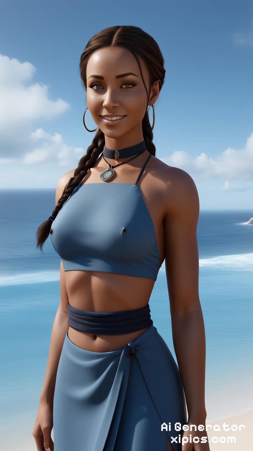 Animation score_9, score_8_up, masterpiece, best quality, 1girl, katara, toned, dark skin, brown hair, long hair, navel, topless, jewelry, looking at viewer, smile, beach background, sunshine, sky, cloud, arms behind back, chained arms bondage, 1girl, katara, brown hair, braid, blue dress, blue eyes, dark skin, choker,