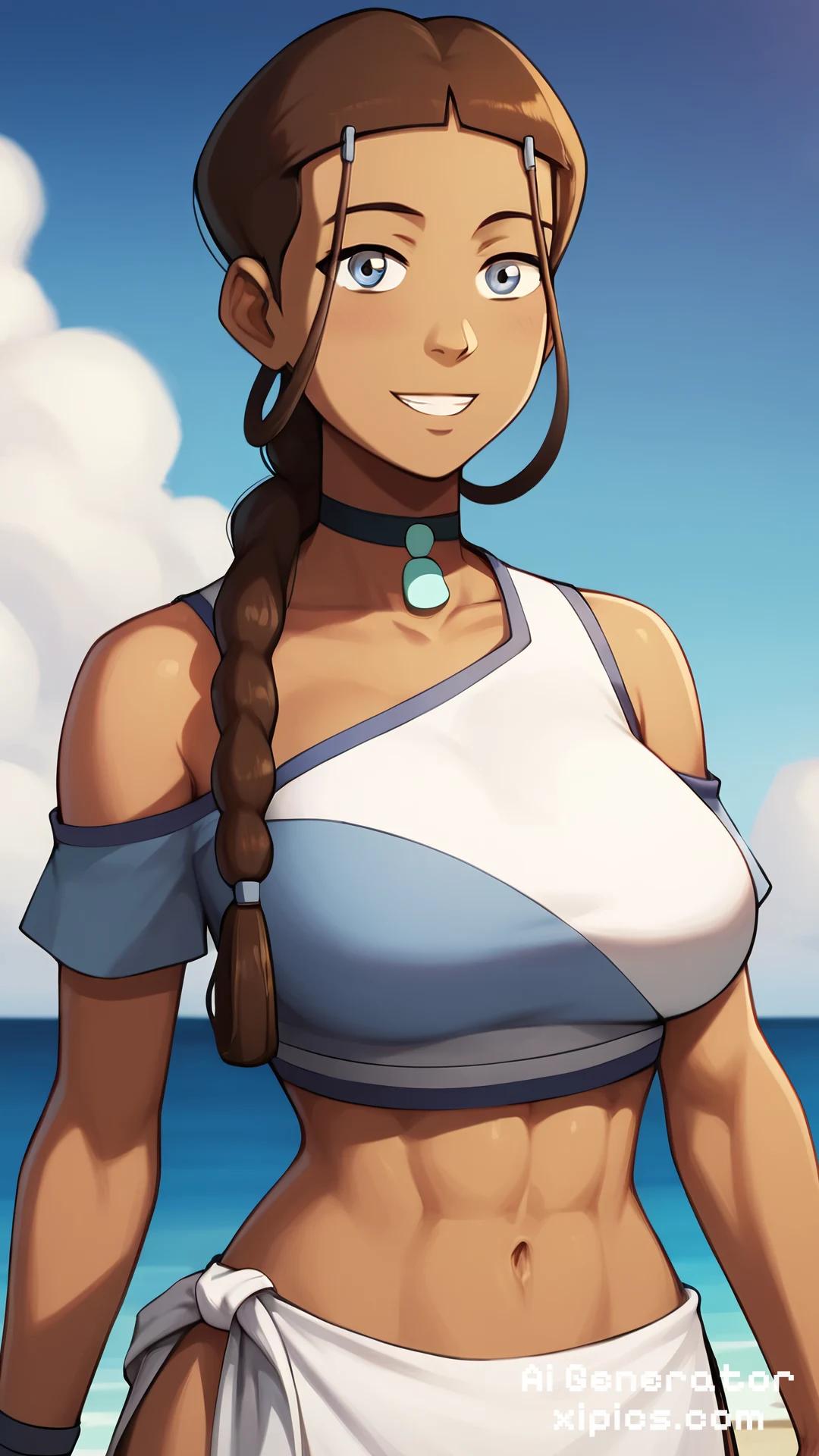 Animation score_9, score_8_up, masterpiece, best quality, 1girl, katara, toned, dark skin, brown hair, long hair, midriff, jewelry, looking at viewer, smile, beach background, sunshine, sky, cloud , big breast, cow spot bikini, 1girl, katara, brown hair, braid, blue dress, blue eyes, dark skin, choker,