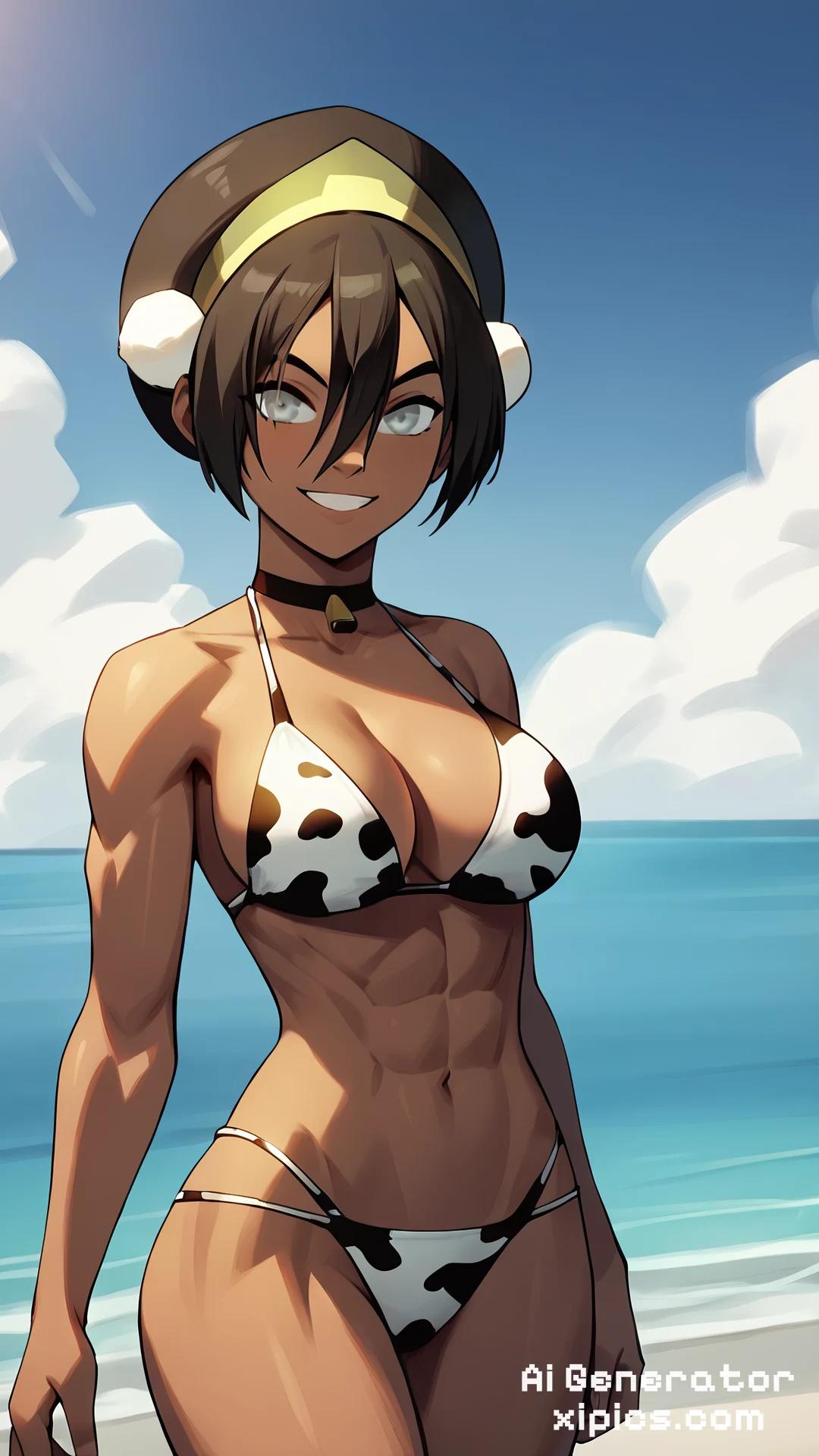 Animation score_9, score_8_up, masterpiece, best quality, 1girl, katara, toned, dark skin, brown hair, long hair, midriff, jewelry, looking at viewer, smile, beach background, sunshine, sky, cloud , big breast, cow spot bikini, 1girl, toph, bangs, black hair, blind, grey eyes, hair between eyes, hair bun, hairband, short hair,