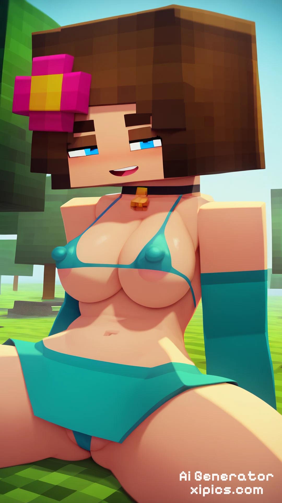Animation score_9, score_8_up, score_7_up, score_6_up, best quality, hd, 8k masterpiece, 1girl, jenny bell, hair flower, short hair, blue eyes, brown hair, pleasured face, thick eyebrows, choker, puffy nipples, sitting, spread legs, wear bikini, looking at viewer, background Minecraft map , Minecraft trees, Minecraft, Minecraft Style,