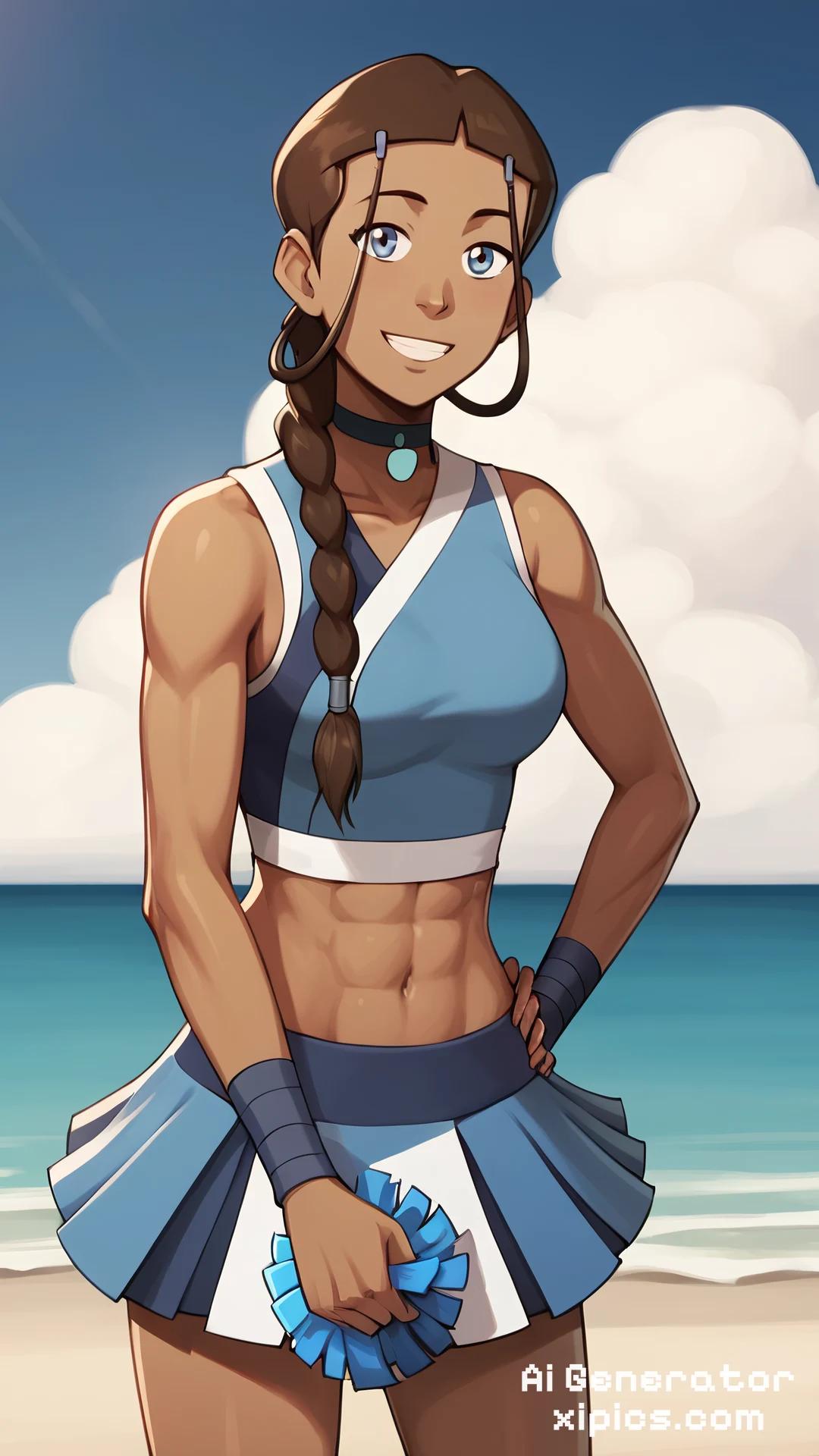 Animation score_9, score_8_up, masterpiece, best quality, 1girl, katara, toned, dark skin, brown hair, long hair, midriff, mini cheerleader skirt , boobs , jewelry, looking at viewer, smile, beach background, sunshine, sky, cloud, 1girl, katara, brown hair, braid, blue dress, blue eyes, dark skin, choker,