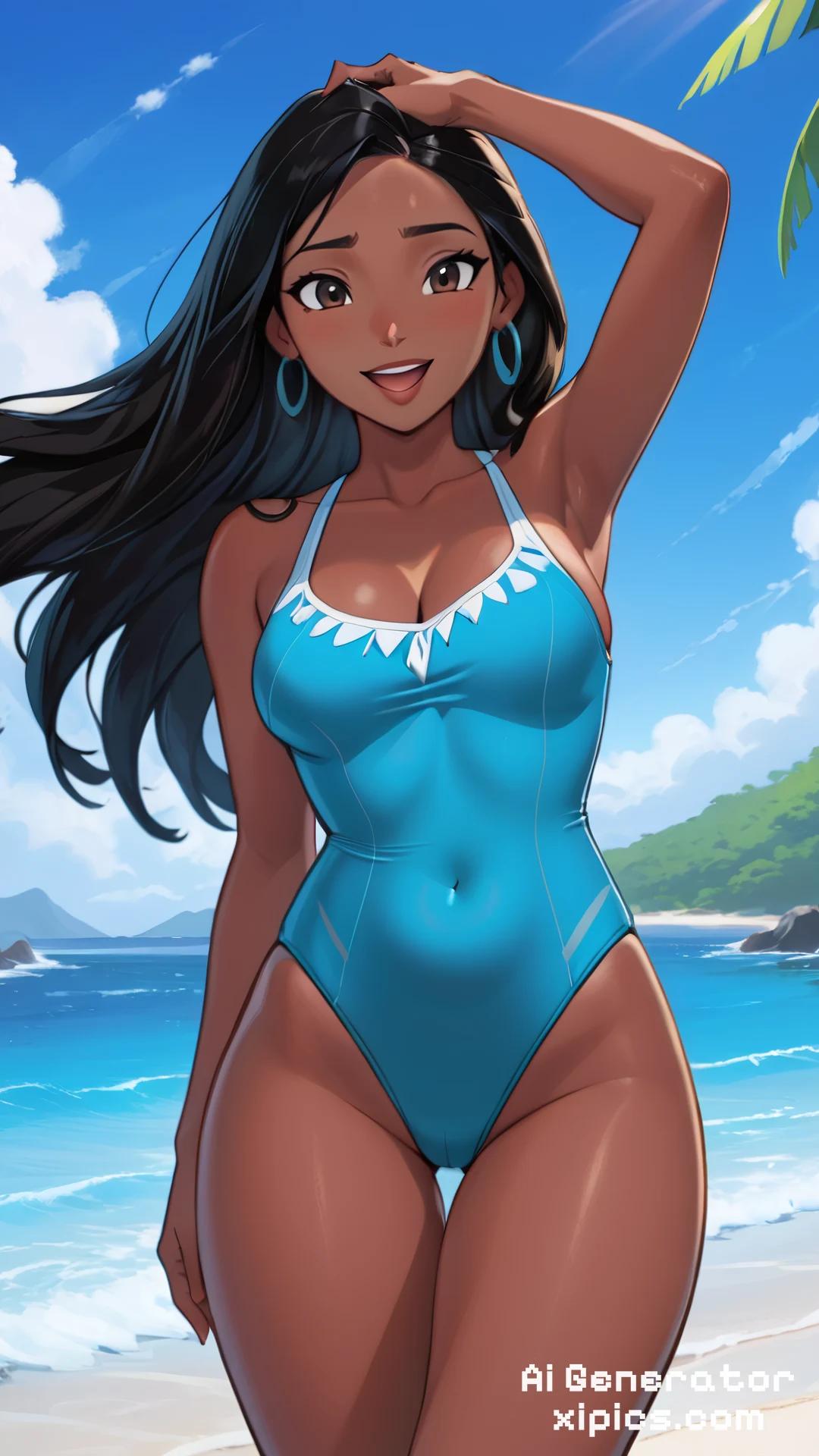 Animation score_9, score_8_up, score_7_up, score_6_up, score_5_up, score_4_up, BREAK, 1girl, pocahontas, black hair, long hair, black eyes, dark skin, G Thong, hands behind head, one-piece swimsuit, open mouth, smile, happy, solo, looking at viewer, sea, sand, blue sky, tropical island background, pocahontas, black hair, long hair, black eyes, dark skin,