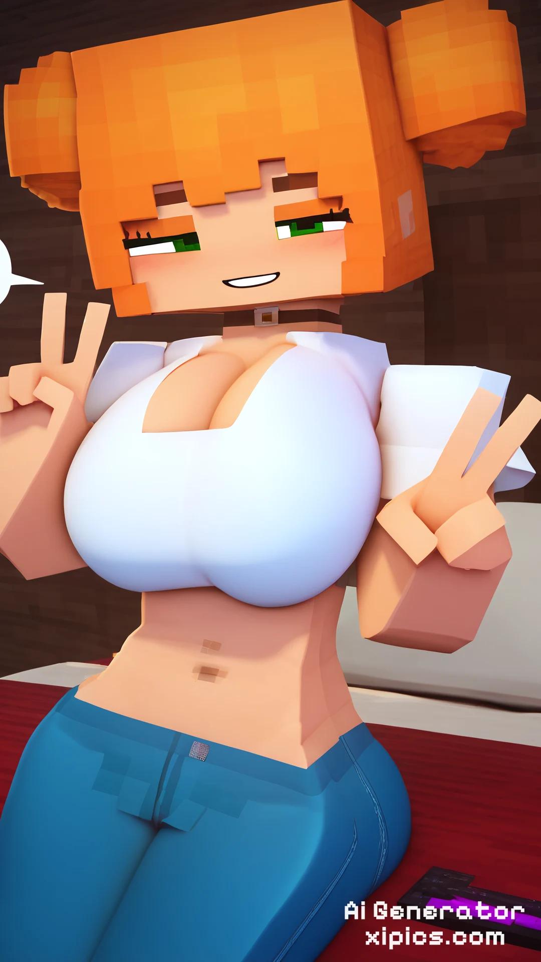 Animation score_9, score_8_up, score_7_up, score_6_up, score_5_up, score_4_up, 3d, sitting, on bed, indoors, bedroom, cowboy shot BREAK 1girl, solo, looking at viewer, smile, large breasts, hair bun, double bun, green eyes, transparent white shirt, orange hair, tight jeans, half-closed eyes, peace sign, spoken heart, Minecraft, Minecraft Style,
