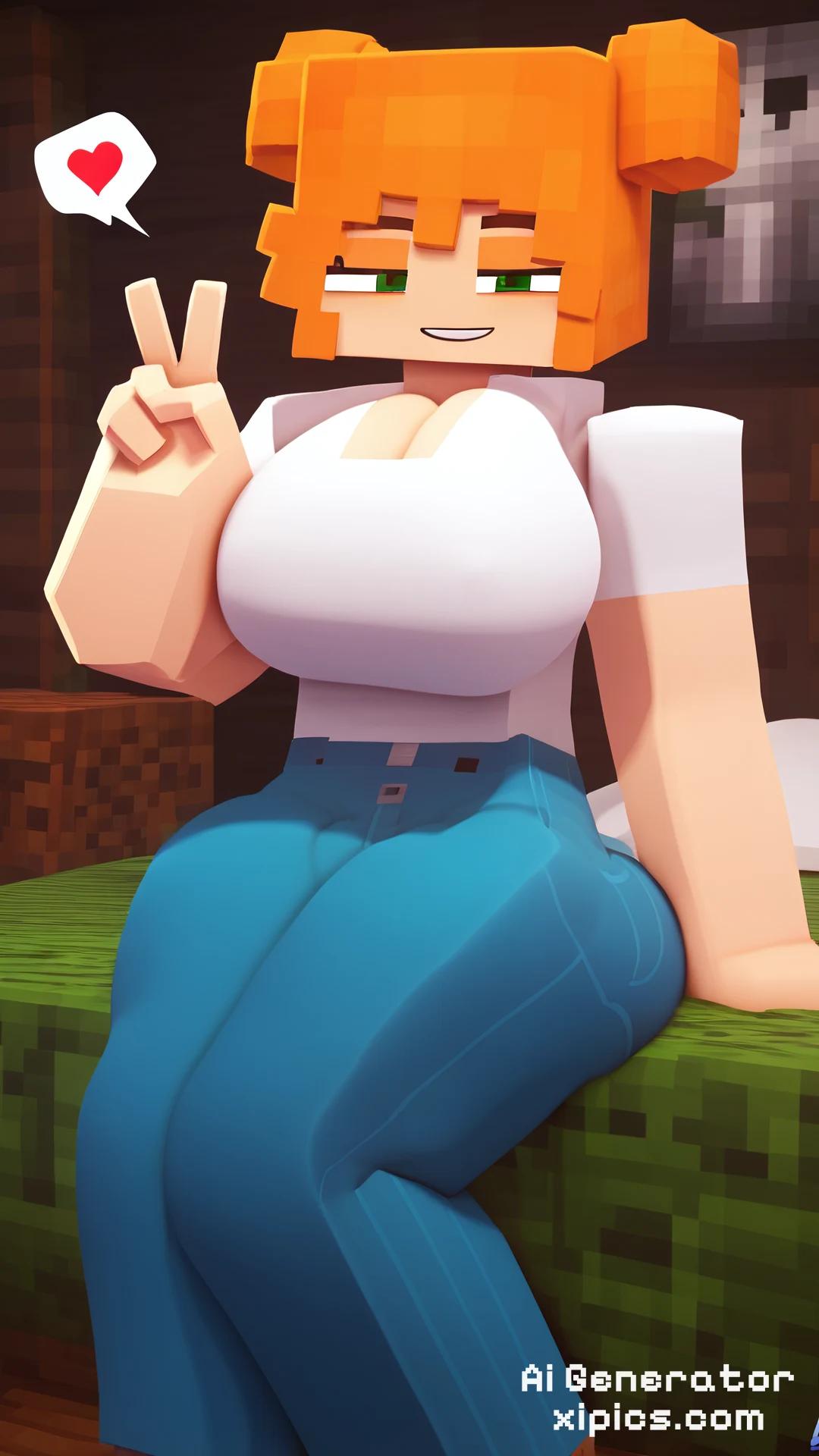 Animation score_9, score_8_up, score_7_up, score_6_up, score_5_up, score_4_up, 3d, sitting, on bed, indoors, bedroom, cowboy shot BREAK 1girl, solo, looking at viewer, smile, large breasts, hair bun, double bun, green eyes, transparent white shirt, orange hair, tight jeans, half-closed eyes, peace sign, spoken heart, Minecraft, Minecraft Style,