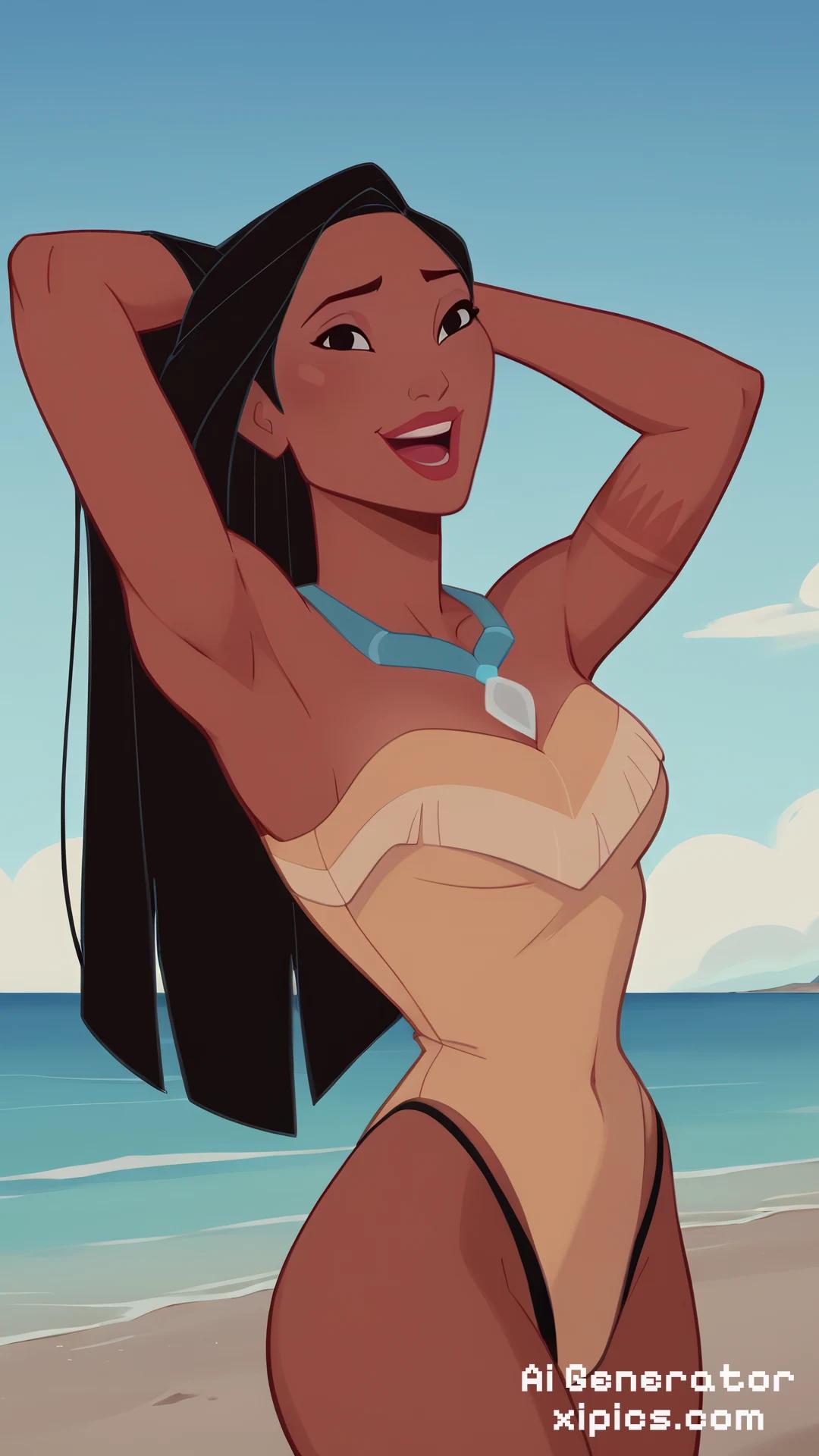 Animation score_9, score_8_up, score_7_up, score_6_up, score_5_up, score_4_up, BREAK, 1girl, pocahontas, black hair, long hair, black eyes, dark skin, G Thong, hands behind head, one-piece swimsuit, open mouth, smile, happy, solo, looking at viewer, sea, sand, blue sky, tropical island background, pocahontas, black hair, long hair, black eyes, dark skin,
