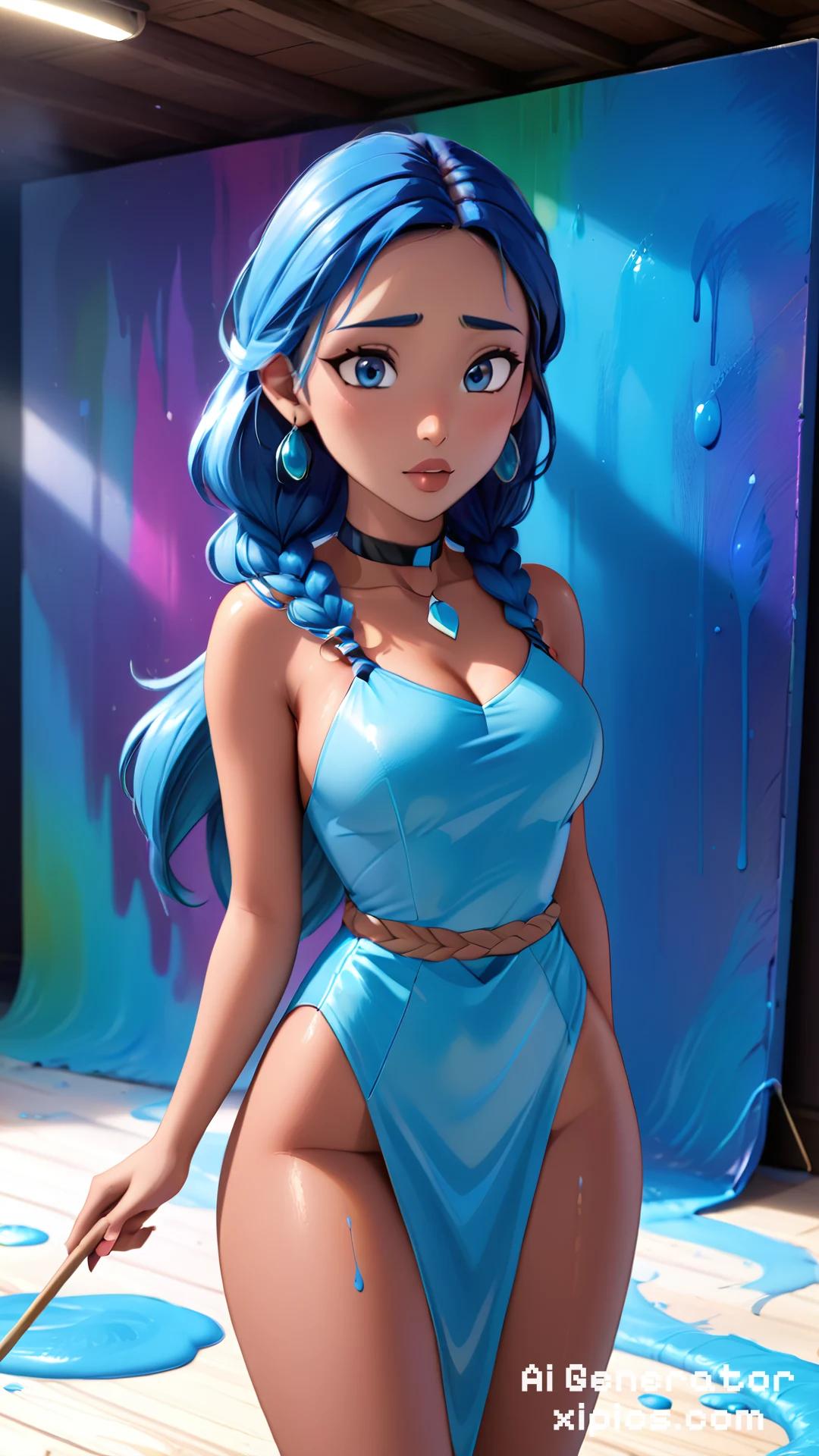 3d render, HD, girl painting, covered in colorful dry paint, paint splashes all over body, blinking an eye, shiny skin, artistic, dynamic angle, full body, body painting, room covered in paint splashes, paintings in the background, from behind, nude, holding a paintbrush, big paint splashes, 1girl, Feathered haircut, boobs, chest, Stocky body, silver eyes, Blue hair, chromatic aberration, colorful, bright colors, 1girl, katara, brown hair, braid, blue dress, blue eyes, dark skin, choker, pocahontas, black hair, long hair, black eyes, dark skin,